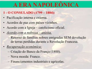 O documento descreve a era napoleônica, incluindo o Consulado, quando Napoleão trouxe estabilidade interna e externa à França; a coroação de Napoleão como imperador em 1804; as guerras e derrotas de Napoleão contra outros países europeus entre 1804-1815; e o Congresso de Viena de 1815, que restaurou monarquias absolutistas e dividiu a Europa em estados para manter o equilíbrio de poder.