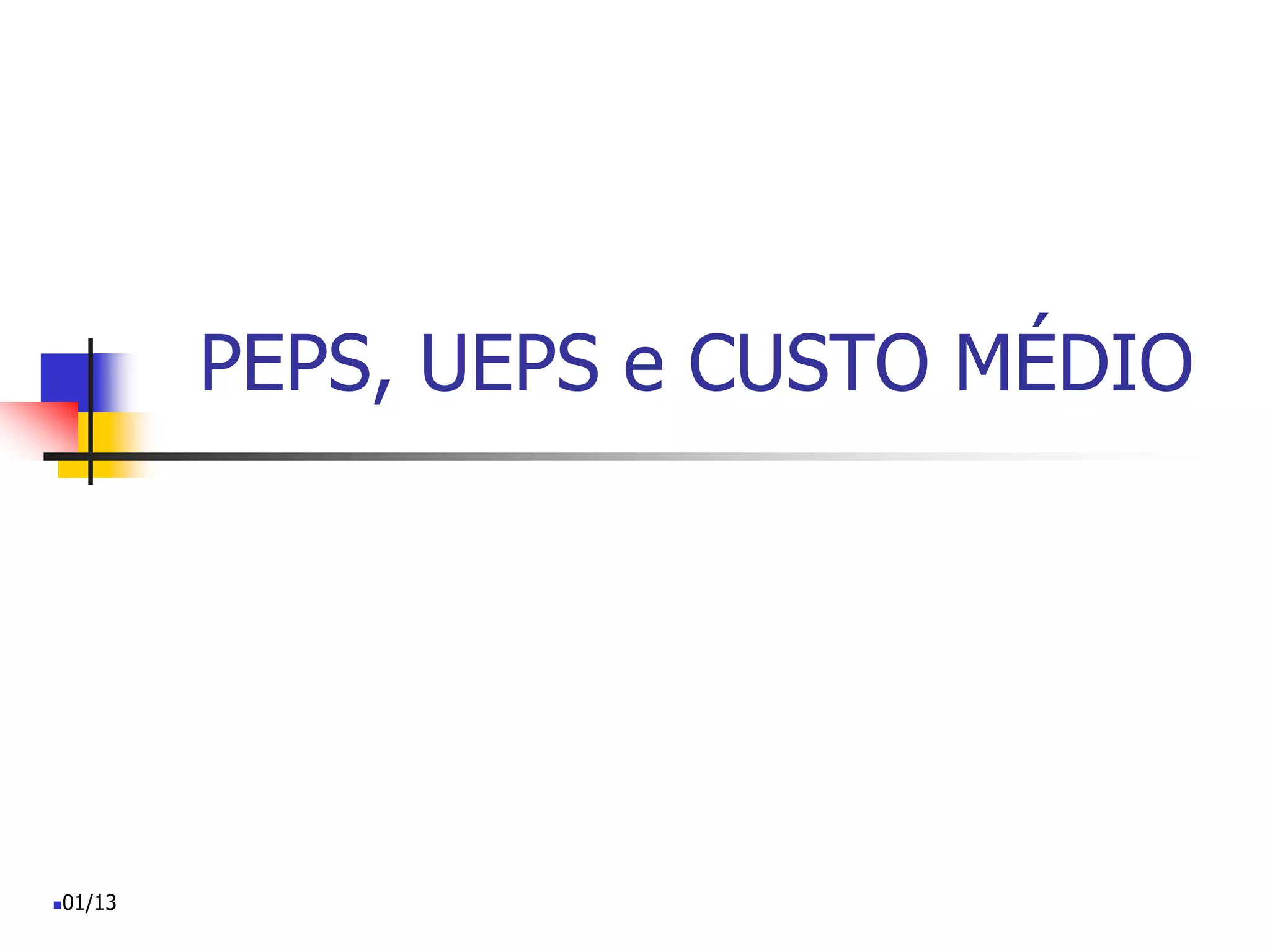 O documento discute três métodos para avaliar estoques: PEPS (primeiro que entra, primeiro que sai), UEPS (último que entra, primeiro que sai) e custo médio. Explica como cada método funciona, suas vantagens e desvantagens, e fornece exemplos numéricos para ilustrar a aplicação de cada método.