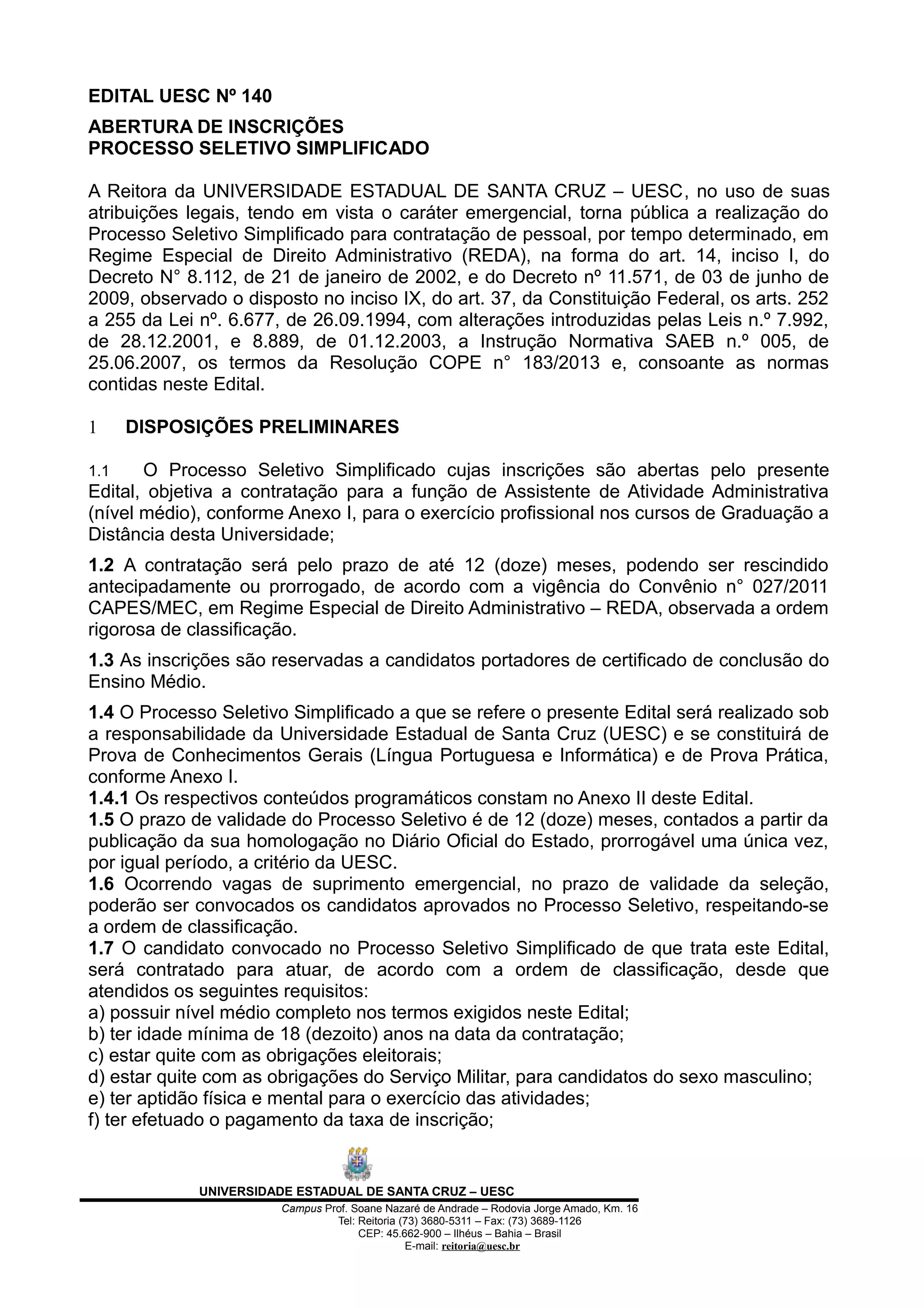 O documento anuncia a abertura de inscrições para um processo seletivo simplificado na Universidade Estadual de Santa Cruz para contratação temporária de assistentes administrativos de nível médio. O processo seletivo consistirá em provas teóricas e práticas sobre língua portuguesa, informática e atividades administrativas. As inscrições poderão ser realizadas online entre os dias 16 a 25 de julho e a seleção ocorrerá em agosto.