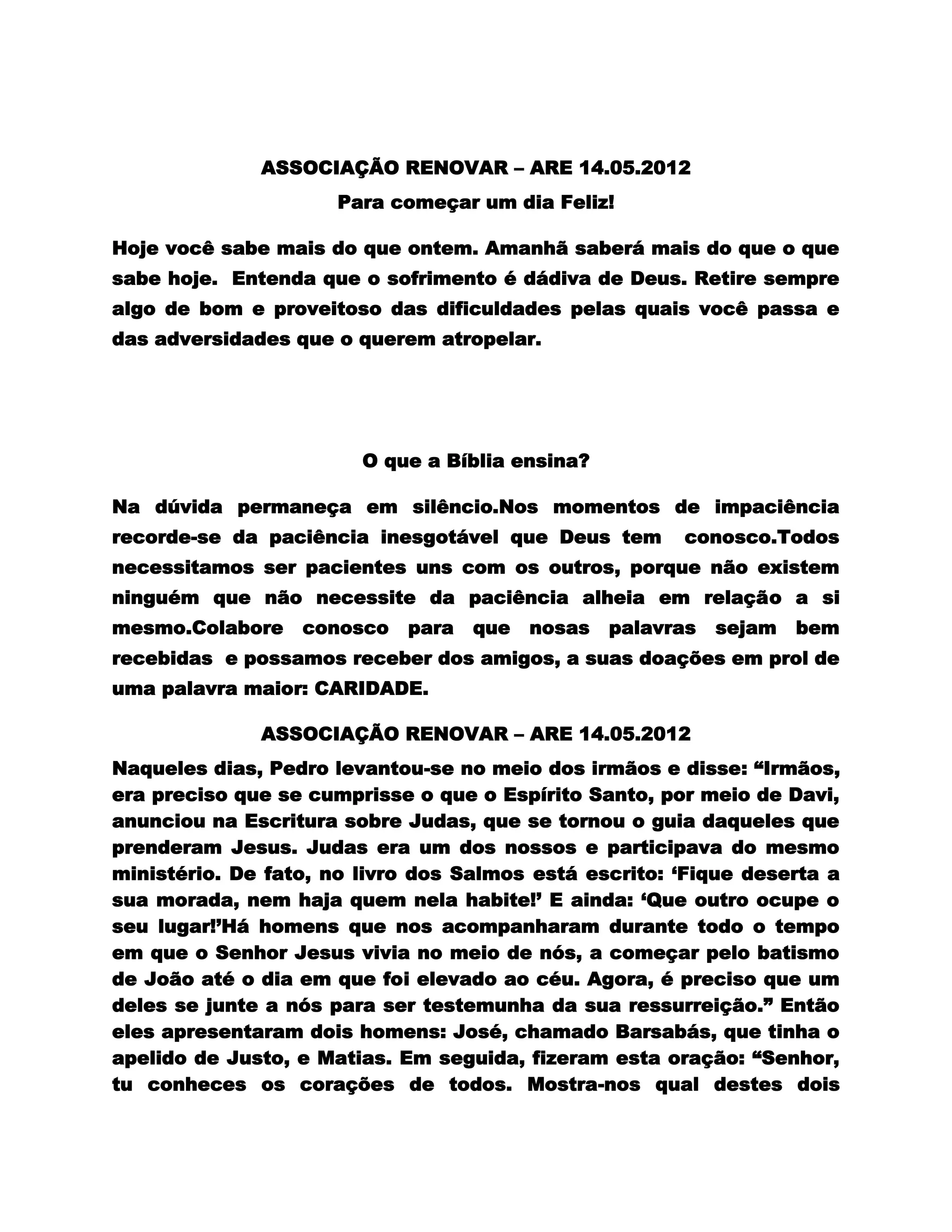 O documento da Associação Renovar enfatiza a importância da paciência, caridade e do amor entre as pessoas, refletindo sobre ensinamentos bíblicos. Ele menciona a necessidade de comunidade e solidariedade, citando a escolha de Matias como novo apóstolo e a relevância do dízimo e das doações para financiar a obra da associação. Além disso, destaca a relação pessoal com Deus e a promessa de vida eterna para aqueles que creem no Filho.