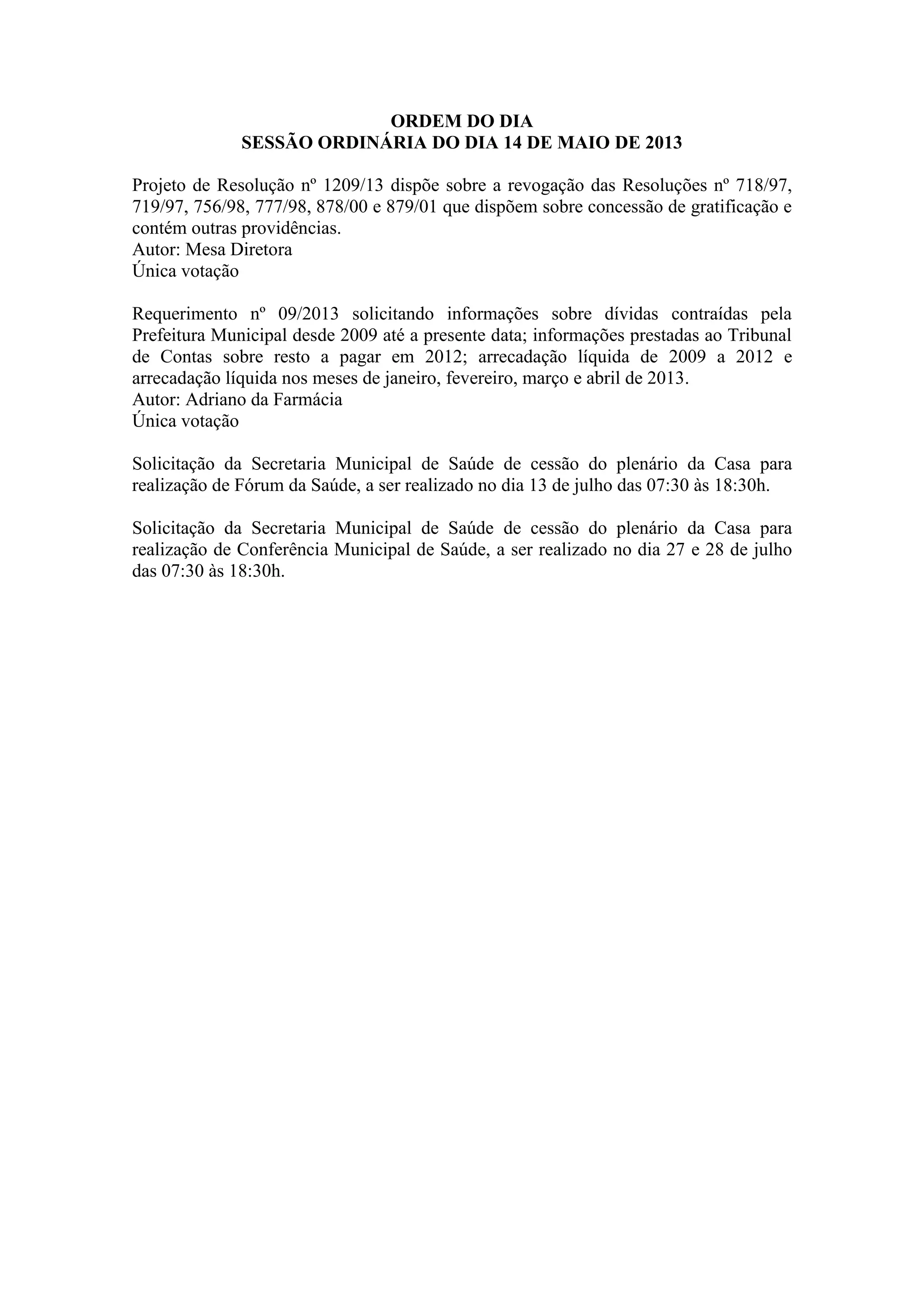 O documento apresenta a ordem do dia de uma sessão ordinária do dia 14 de maio de 2013, com três itens principais: 1) um projeto de resolução para revogar resoluções anteriores sobre gratificação; 2) um requerimento solicitando informações sobre dívidas e arrecadação municipal; 3) duas solicitações da Secretaria de Saúde para realizar eventos no plenário da Casa.