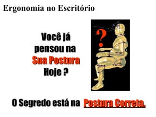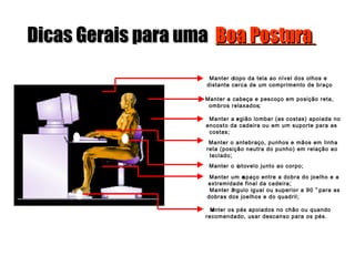 Este documento discute a importância da postura ergonômica no escritório. Ele fornece dicas sobre como manter uma postura correta, incluindo manter a tela do monitor na altura dos olhos, apoiar as costas no encosto da cadeira, manter os braços em ângulo reto em relação ao corpo e usar um suporte para os pés. A má postura pode causar dores e desconforto, enquanto a postura neutra promove mais produtividade e conforto.
