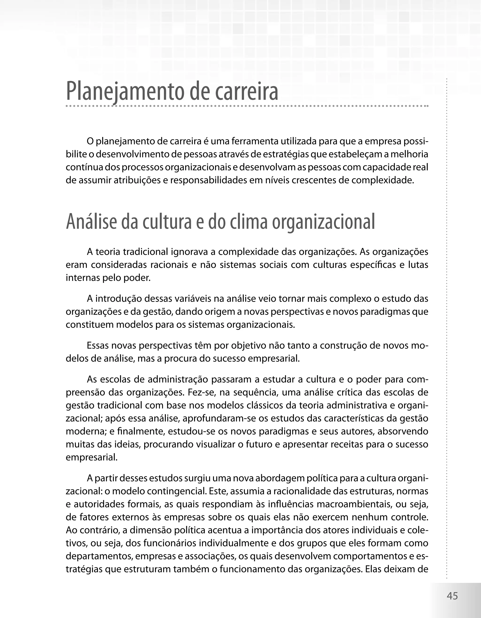 O documento discute planejamento de carreira, análise da cultura e clima organizacional e a diferenciação entre organizações formais e informais. Ele explora como o planejamento de carreira pode desenvolver pessoas e melhorar processos organizacionais, além de analisar como a cultura e o clima afetam o funcionamento e desempenho de uma organização. Também distingue as características das organizações formais, baseadas em estruturas hierárquicas, de organizações informais, que se formam a partir das interações entre pessoas.