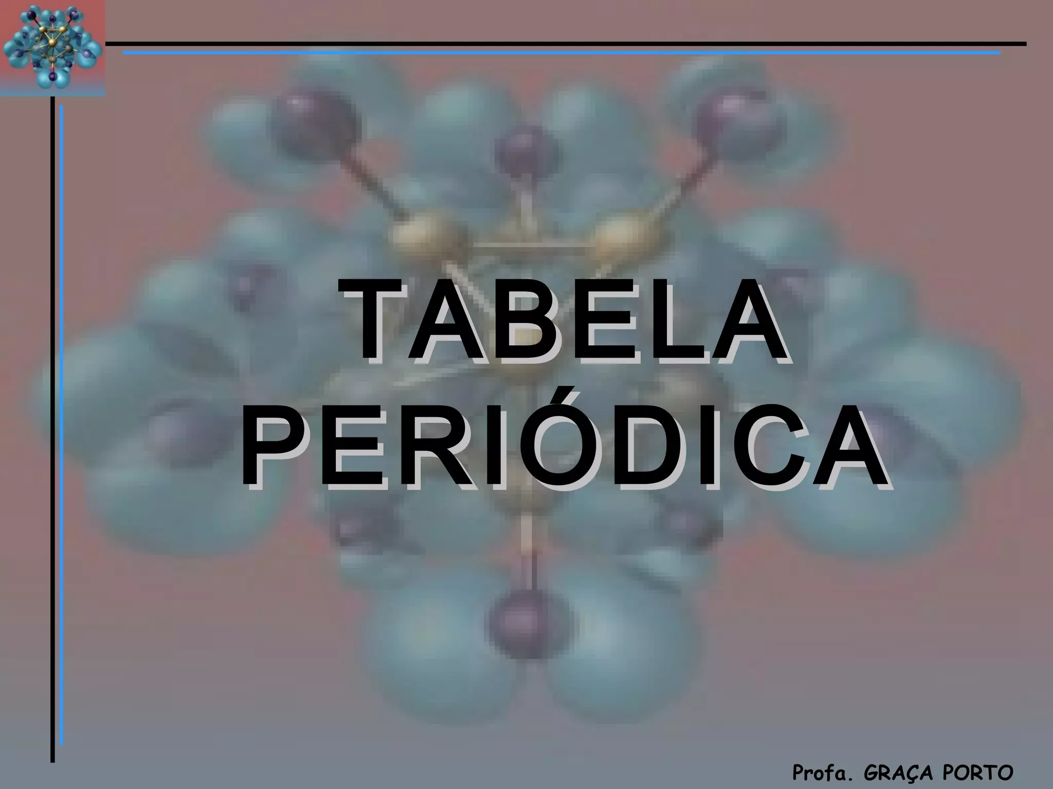 O documento descreve a história da tabela periódica, incluindo as contribuições de Döbereiner, Newlands e Mendeleiev. Explica a organização dos elementos de acordo com seus números atômicos em períodos e grupos, e as propriedades dos metais, ametais e gases nobres.