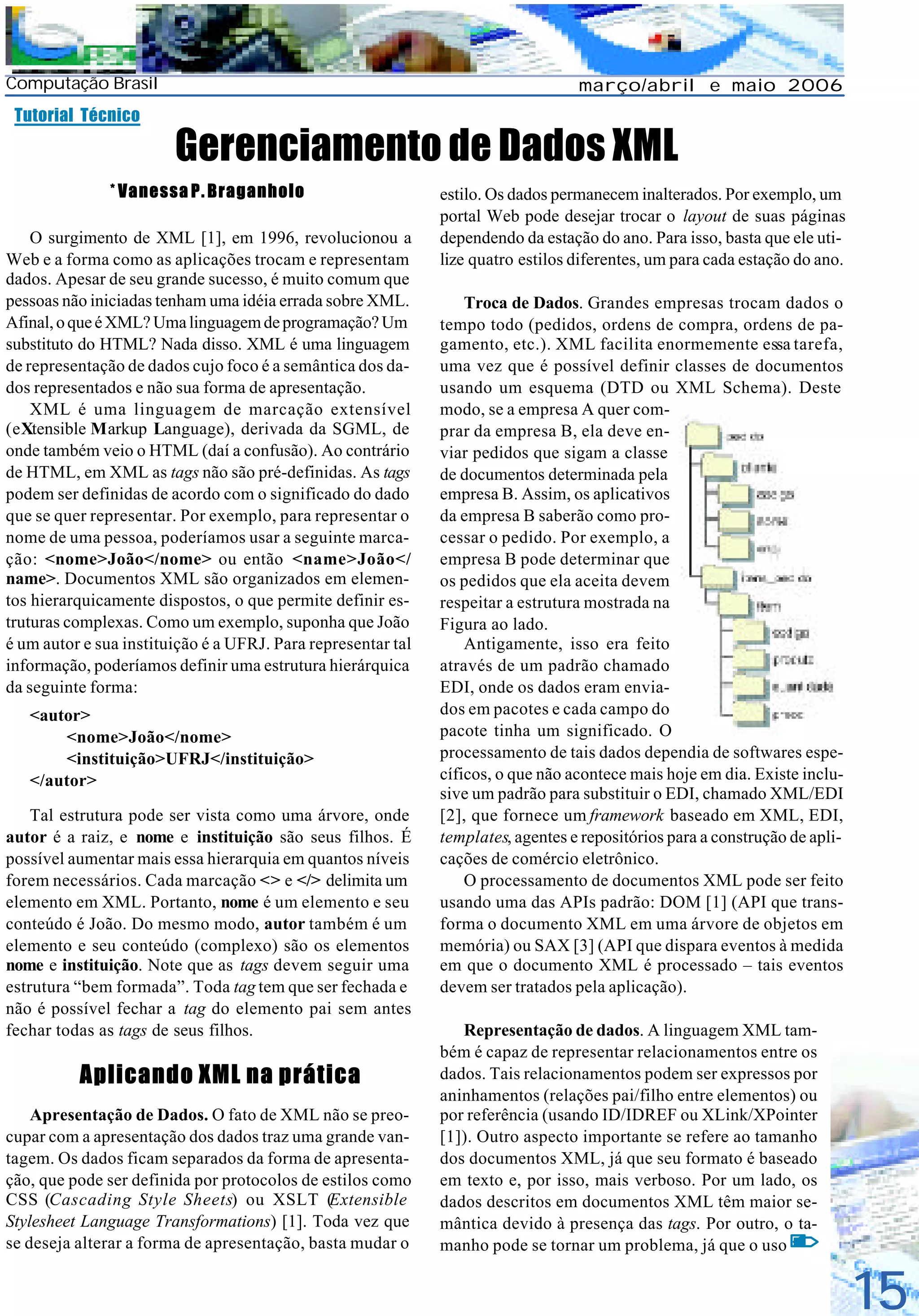 O documento discute o uso de XML para representação e troca de dados. XML permite a separação dos dados da apresentação, permitindo que os mesmos dados sejam estilizados de diferentes formas. XML também facilita a troca de dados entre empresas através da definição de padrões comuns para classes de documentos, como pedidos e pagamentos. Além disso, XML pode representar relacionamentos hierárquicos complexos entre dados.