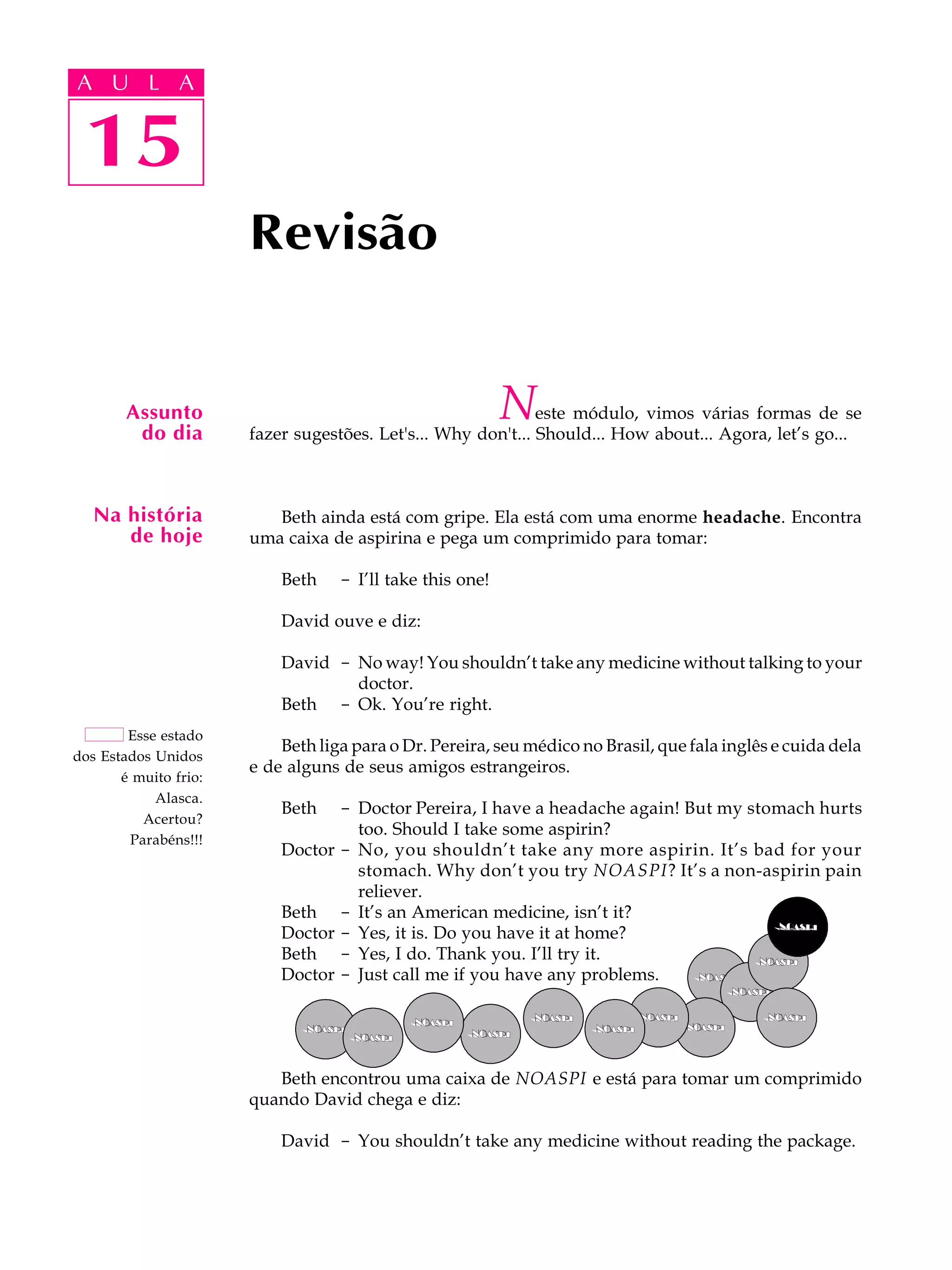 Beth está com dor de cabeça e estômago. Ela liga para o Dr. Pereira, que recomenda que ela tome NOASPI ao invés de aspirina, pois é mais gentil com o estômago. Quando Beth está para tomar o remédio, David diz que ela deve ler a bula primeiro. A bula explica como tomar o remédio com segurança e dá advertências sobre uso indevido.