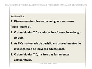 Este documento descreve competências a desenvolver com a unidade curricular de Comunicação e Tecnologias em Supervisão Pedagógica e Formação de Formadores. Os objetivos são desenvolver competências de análise crítica, intervenção e consultoria sobre tecnologias e seus usos, ferramentas digitais e assessoria sobre projetos educacionais com TICs. Os conteúdos programáticos incluem discussões sobre informação, comunicação, pesquisa com tecnologias e apresentações.