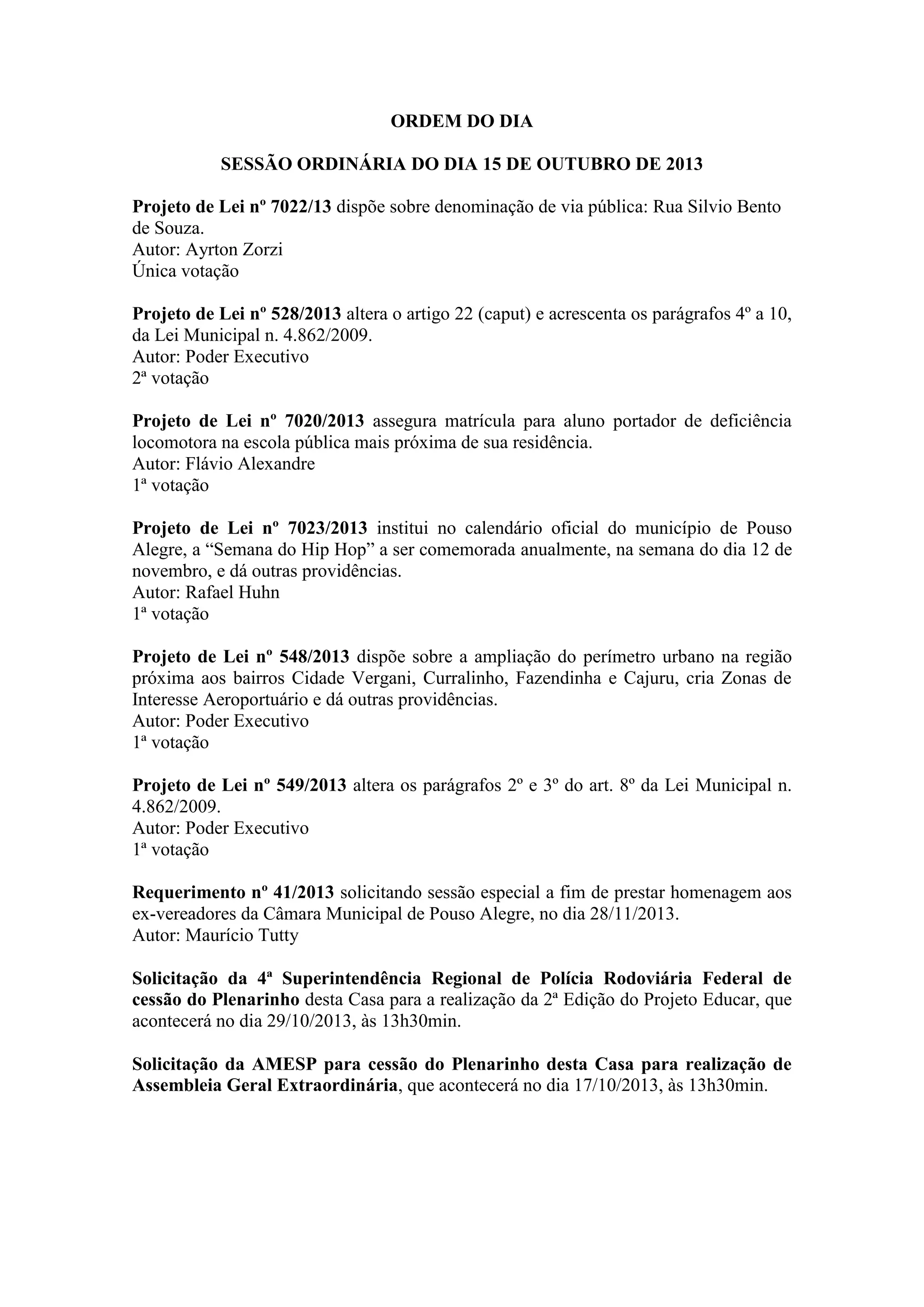 O documento apresenta a ordem do dia de uma sessão ordinária de 15 de outubro de 2013 na Câmara Municipal de Pouso Alegre. A pauta inclui sete projetos de lei para votação, um requerimento e duas solicitações de cessão do Plenarinho para eventos.