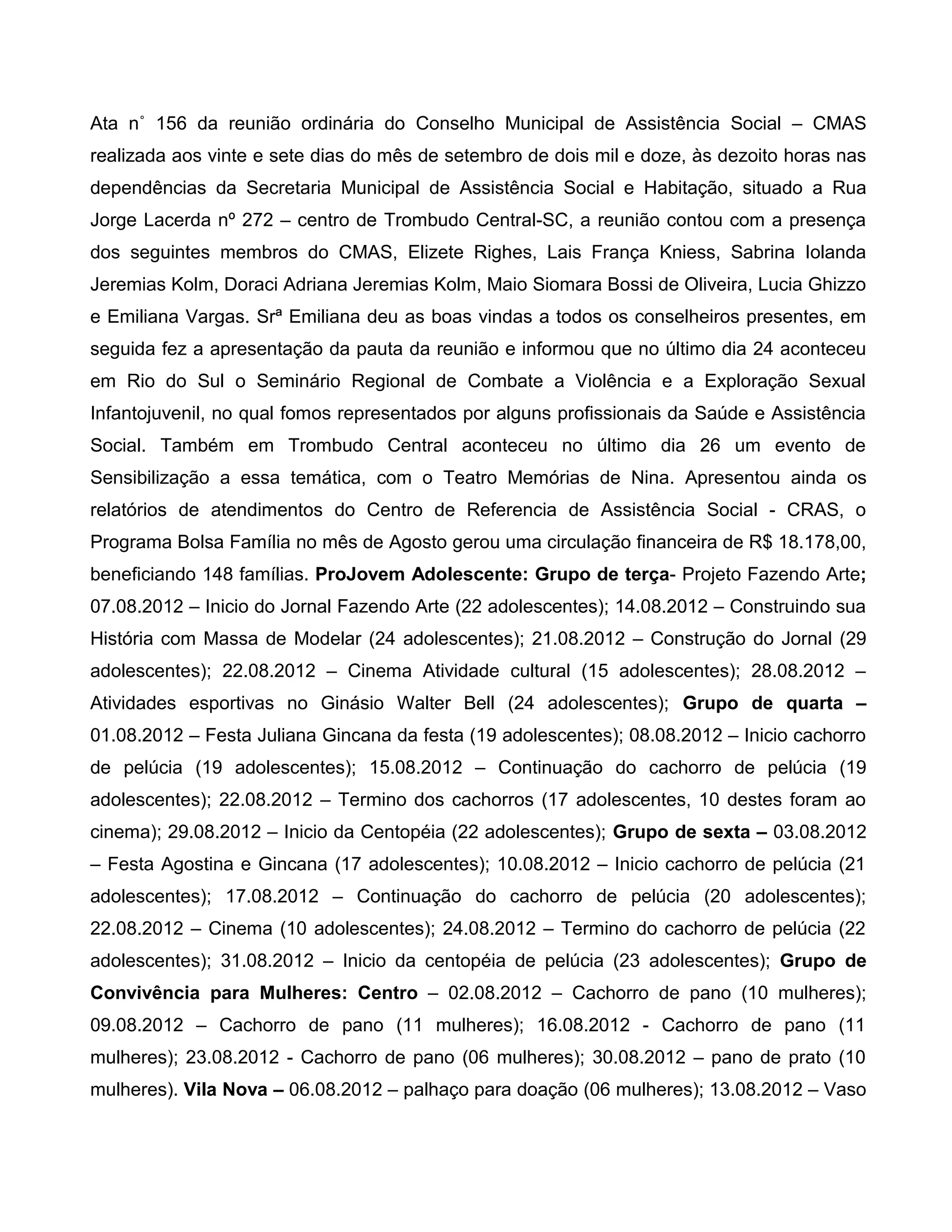 A reunião do Conselho Municipal de Assistência Social relatou os programas e atendimentos realizados no mês de agosto de 2012, incluindo o Programa Bolsa Família, ProJovem Adolescente, Grupo de Convivência para Mulheres e Brinquedoteca. A ata também relata a eleição da nova mesa diretora do CMAS.