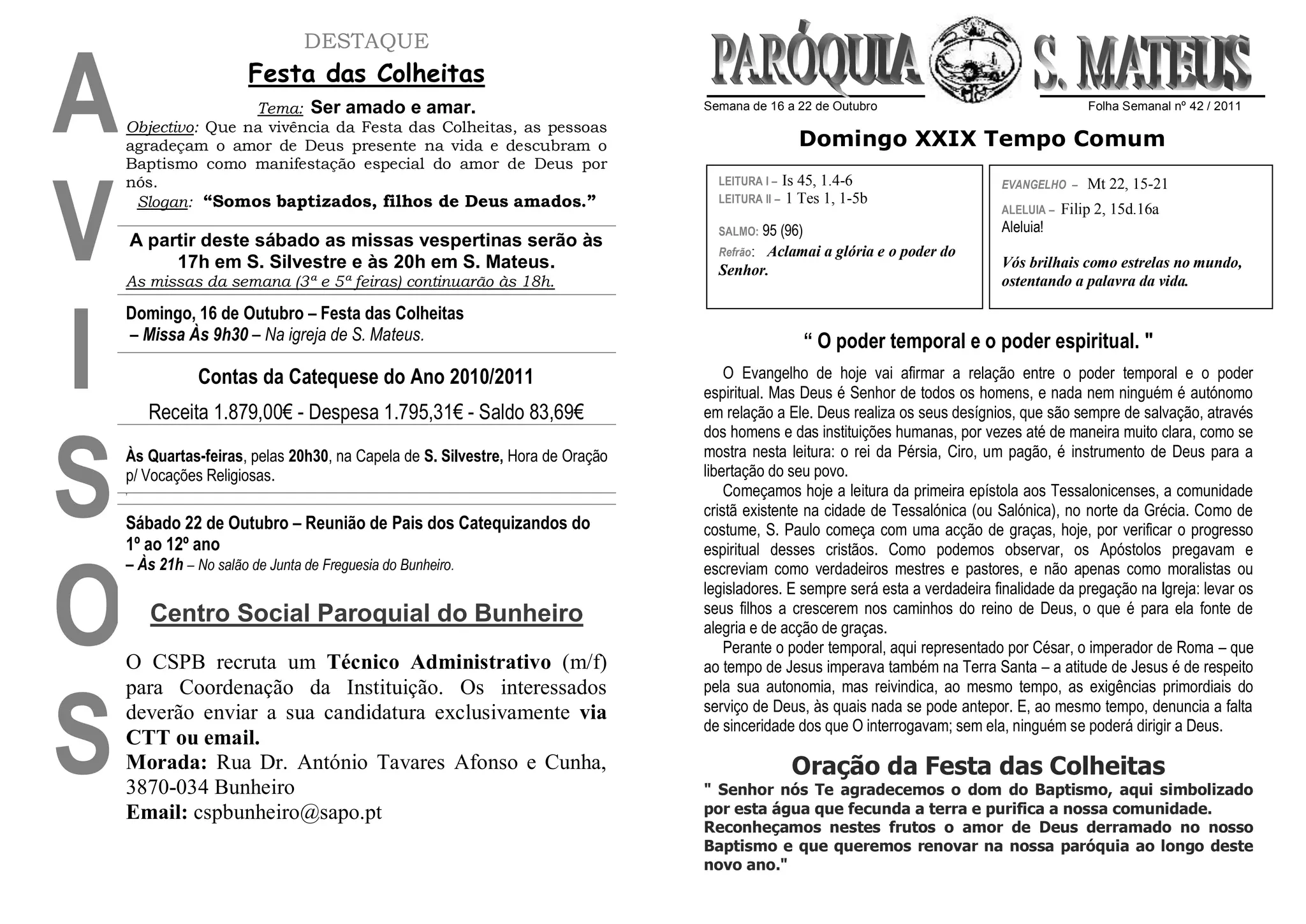 [1] O documento anuncia a Festa das Colheitas na paróquia com o tema de "Ser amado e amar" e o slogan "Somos batizados, filhos de Deus amados". [2] Detalha as leituras bíblicas e a homilia do domingo sobre o poder temporal e espiritual. [3] Fornece informações sobre missas, reuniões, contas da catequese e uma vaga de emprego no Centro Social Paroquial do Bunheiro.