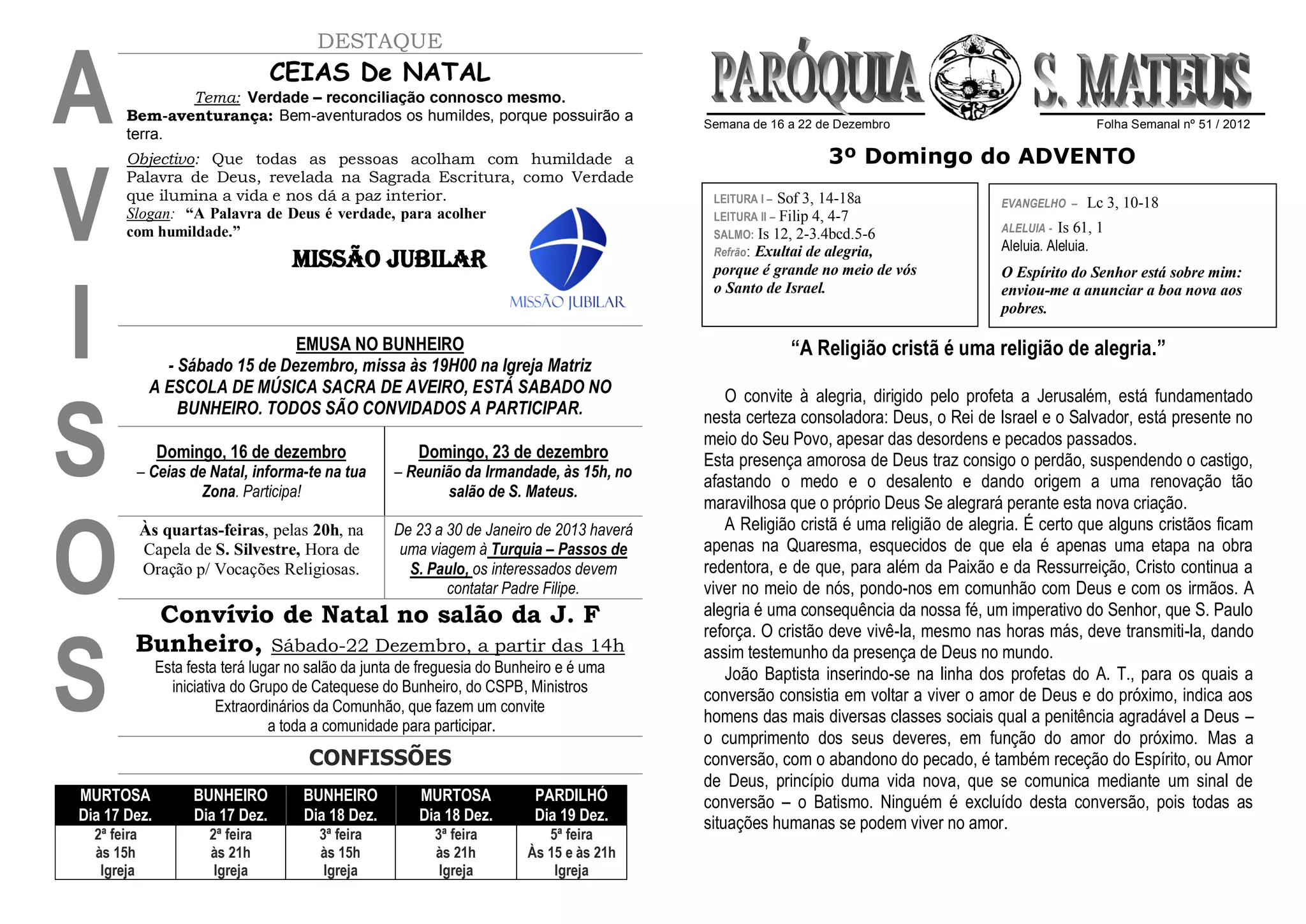 Este documento anuncia as atividades de Natal e Advento em várias paróquias, incluindo missas, confissões, ceias de Natal e reuniões. Também resume as leituras bíblicas para o terceiro Domingo do Advento e convida os fiéis a viverem a fé cristã com alegria.