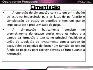 A aula descreve os processos de cimentação de poços de petróleo, incluindo sua história, tipos, classificação de cimentos e aditivos. A cimentação consiste no preenchimento do espaço entre os tubos e a parede do poço para unir a tubulação e isolar zonas. Ela evoluiu ao longo do tempo com novos métodos e cimentos especiais para diferentes profundidades e condições.