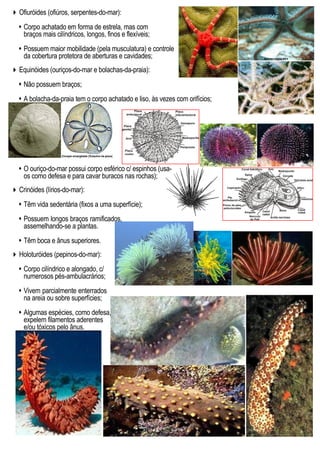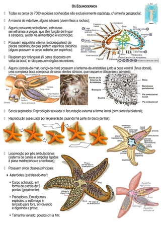 Os equinodermos são animais marinhos exclusivos com simetria pentaradial. A maioria vive livremente, enquanto alguns são sésseis. Possuem esqueleto interno de placas calcárias e sistemas como pedicelários, brânquias e lanterna de Aristóteles para se alimentar, respirar e se locomover. As cinco classes principais são asteróides, ofiuróides, equinóides, crinóides e holoturóides, que variam na forma do corpo, hábitos e característic