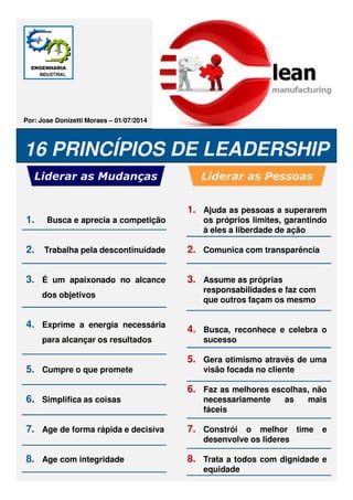 O documento lista 16 princípios de liderança divididos em duas categorias: liderar as mudanças e liderar as pessoas. Alguns desses princípios incluem buscar a competição, trabalhar pela descontinuidade, ajudar as pessoas a superarem seus limites, comunicar com transparência, assumir responsabilidades e reconhecer o sucesso.