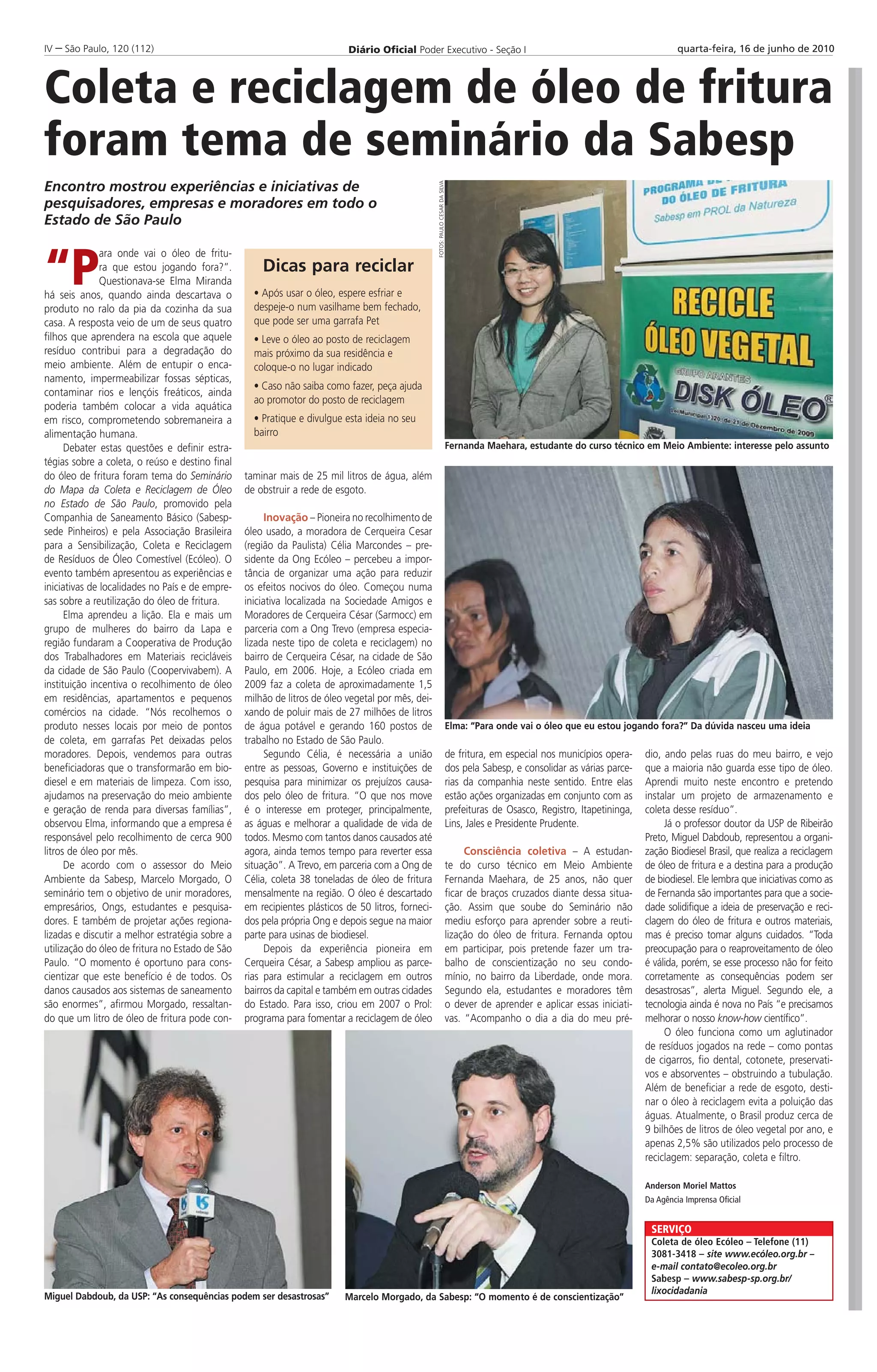 O seminário discutiu iniciativas de coleta e reciclagem de óleo de fritura no Estado de São Paulo. Uma cooperativa incentiva a coleta do óleo em residências e comércios e o vende para reciclagem. A Sabesp promove parcerias para estimular a reciclagem em mais cidades paulistas. A conscientização da população é essencial para evitar danos ao meio ambiente causados pelo descarte incorreto do óleo.