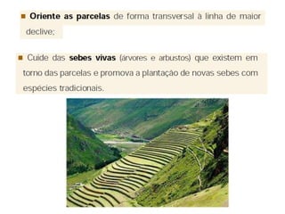 O documento discute o conceito de desenvolvimento sustentável e sua aplicação na agricultura e no contexto português. Aborda princípios como preservação ambiental, crescimento econômico e igualdade social. Também descreve práticas agrícolas sustentáveis como a agricultura biológica e produção integrada, com foco na conservação dos solos e recursos naturais.