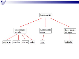 O documento descreve os diferentes métodos de locomoção utilizados pelos animais, incluindo reptação, marcha, corrida, salto, voo, natação. Detalha as adaptações físicas necessárias para cada método, como asas para voar, barbatanas para nadar, e membranas interdigitais para auxiliar a natação de aves e anfíbios aquáticos.