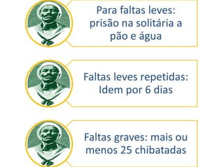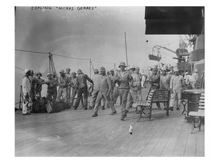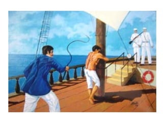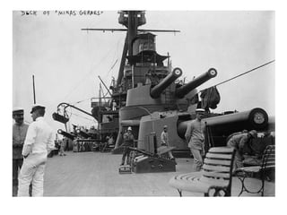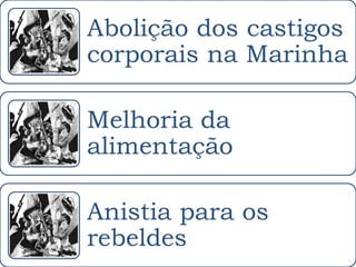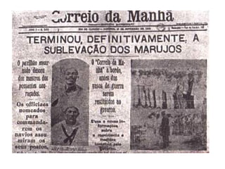 O documento discute a Revolta da Chibata de 1910, quando marinheiros se rebelaram contra os castigos físicos a bordo dos navios. Eles sequestraram navios de guerra e ameaçaram bombardear o Rio de Janeiro até que o governo proibisse a chibata. Apesar de inicialmente concordar com anistia, o governo prendeu e torturou os revoltosos depois. A revolta levou o governo brasileiro a ceder pela primeira vez a uma ação popular.