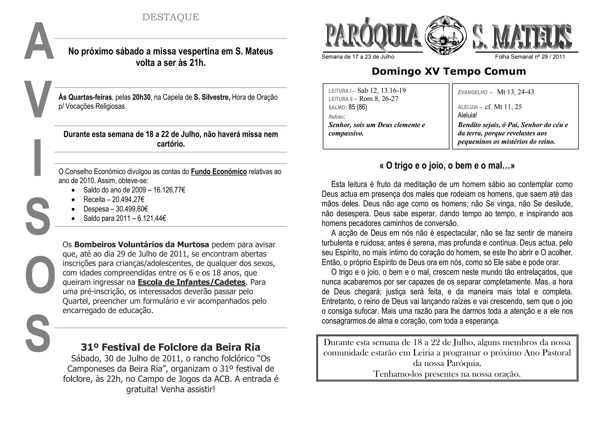 [1] O documento anuncia alterações nos horários das missas aos sábados e quartas-feiras na igreja de S. Mateus e Capela de S. Silvestre respectivamente [2] Apresenta as contas do Fundo Económico da paróquia para 2010 com um saldo final para 2011 de 6.121,44€ [3] Pede inscrições de crianças e adolescentes entre 6-18 anos para a Escola de Infantes/Cadetes dos Bombeiros Voluntários da Murtosa.