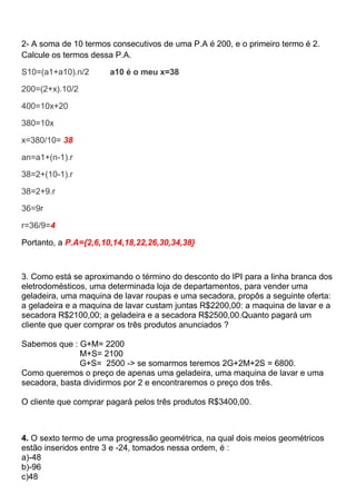 O documento apresenta a resolução de 5 questões de matemática. Na primeira questão, o autor resolve uma equação de segundo grau para encontrar o valor de x em uma progressão aritmética. Na segunda questão, ele calcula os termos de uma outra progressão aritmética. E na terceira questão, resolve um problema envolvendo descontos em eletrodomésticos.