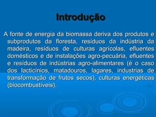 Este documento discute a energia da biomassa. Explica que a energia da biomassa vem de produtos e subprodutos florestais, resíduos agrícolas e industriais. Detalha dois processos de conversão de biomassa em energia: combustão direta e digestão anaeróbia para produção de biogás. Também discute como a queima de biomassa pode regular as emissões de CO2 atmosférico.