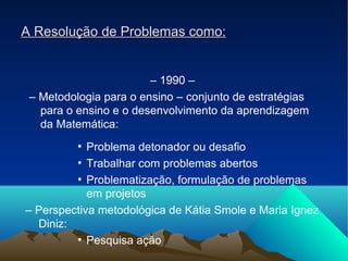 O documento discute a evolução da abordagem de resolução de problemas no ensino da matemática ao longo dos anos 1980-1990. Inicialmente focada nos procedimentos para obter respostas, passou a enfatizar o desenvolvimento de competências e a aplicação dos conhecimentos a novas situações. Nos anos 1990, surgiram metodologias que utilizam problemas detonadores e a problematização para tornar o ensino mais ativo. A comunicação é essencial nesse processo, para que os alunos desenvolvam autonomia e confiança.