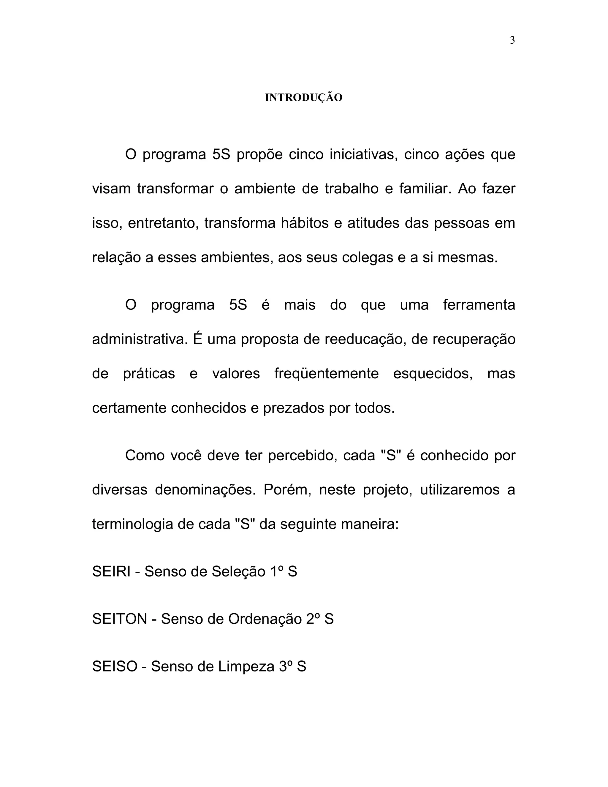 O documento discute o programa 5S, que propõe cinco iniciativas para transformar o ambiente de trabalho: Seiri (senso de seleção), Seiton (senso de ordenação), Seiso (senso de limpeza), Seiketsu (senso de conservação) e Shitsuke (senso de autodisciplina). Cada "S" visa melhorar aspectos físicos, intelectuais e comportamentais do ambiente, promovendo a qualidade e a produtividade.