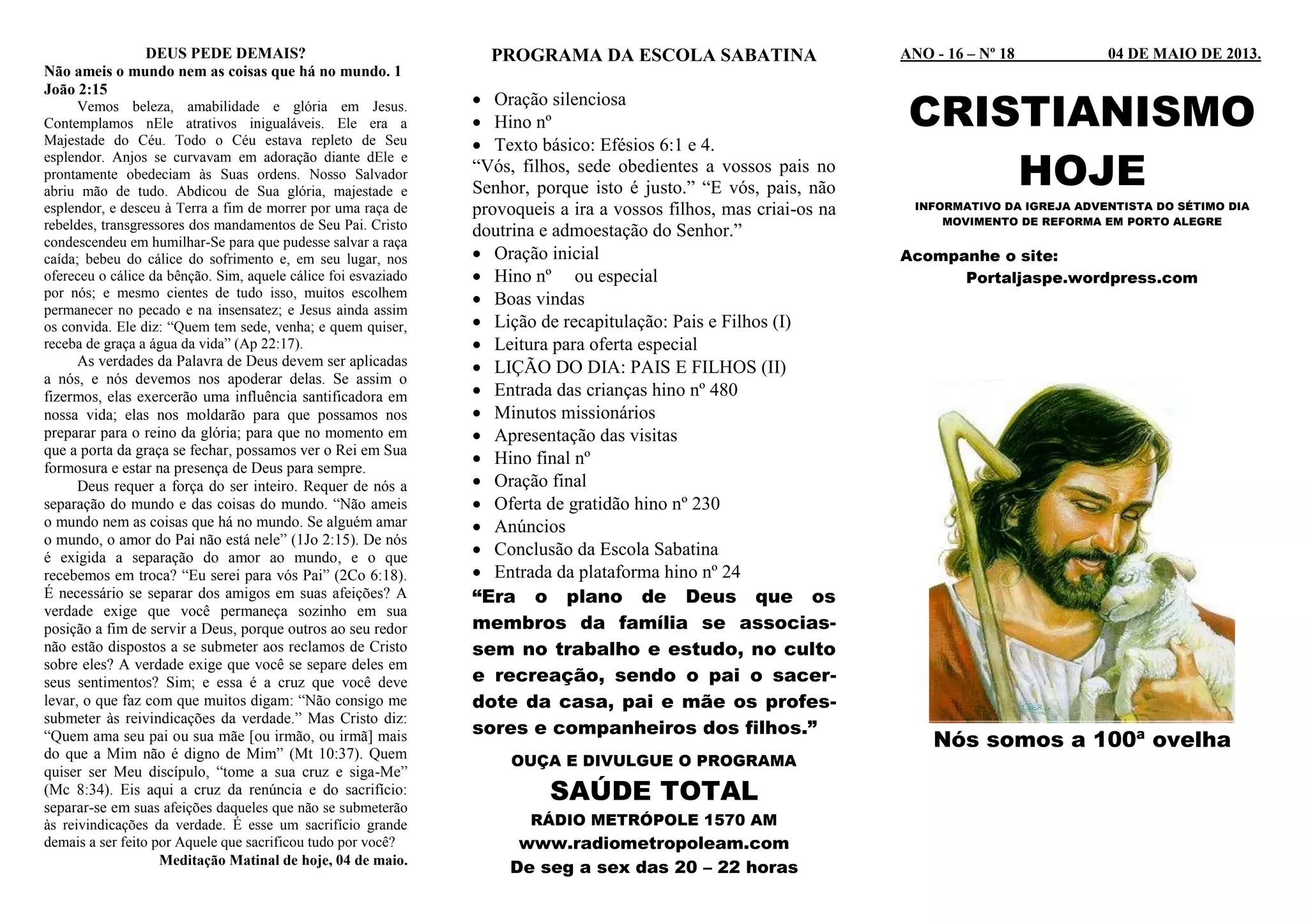 O documento discute a importância da família na educação cristã e o papel dos pais e filhos. Apresenta um programa de Escola Sabatina com uma lição sobre pais e filhos, enfatizando a obediência dos filhos e o amor e orientação dos pais. Também reflete sobre a necessidade de separação do mundo e a cruz do sacrifício para seguir a Cristo.