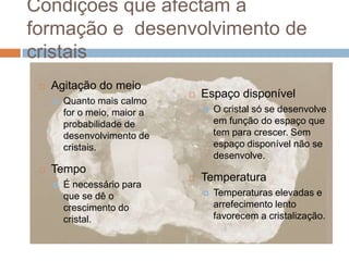 Este documento discute as condições que afetam a formação e desenvolvimento de cristais em magmas consolidados, incluindo a agitação do meio, tempo, temperatura e espaço disponível. Também explica como a estrutura cristalina é constante para cada mineral, enquanto a forma dos cristais depende das condições. Finalmente, aborda isomorfismo e polimorfismo, onde minerais podem ter composições ou estruturas cristalinas semelhantes.