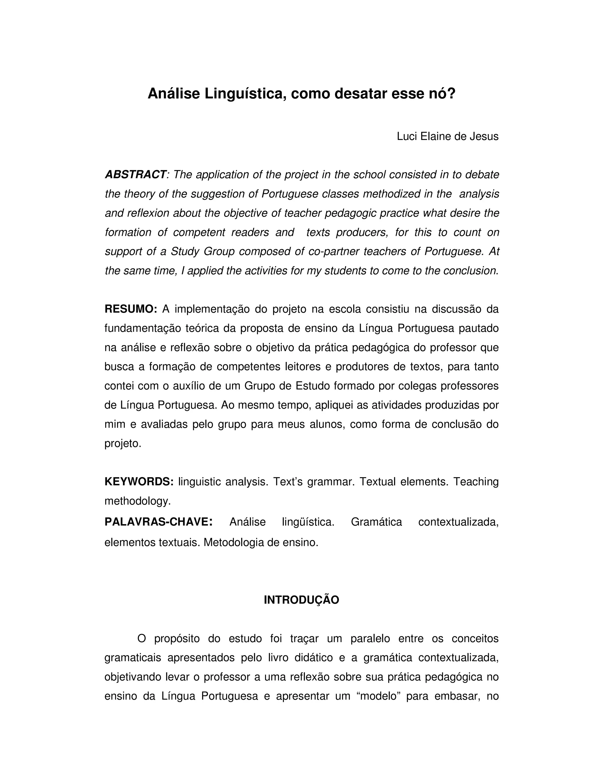O documento discute a implementação de um projeto pedagógico em uma escola que teve como objetivo debater a teoria do ensino da Língua Portuguesa com foco na análise e reflexão sobre a prática docente, visando a formação de leitores e produtores de texto competentes. O projeto contou com o apoio de um grupo de estudos de professores e atividades foram aplicadas aos alunos para conclusão do projeto.