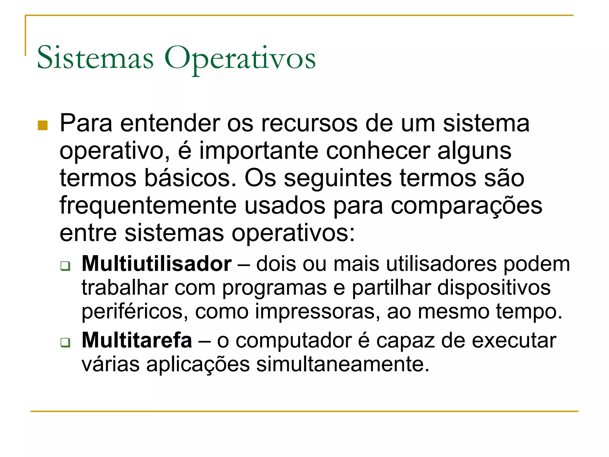 O documento descreve os principais termos relacionados a sistemas operativos, incluindo multiusuário, multitarefa, multiprocessamento e multiencadeamento. Também explica os modos de operação de CPUs modernos, como modo real, protegido, real virtual e de compatibilidade.