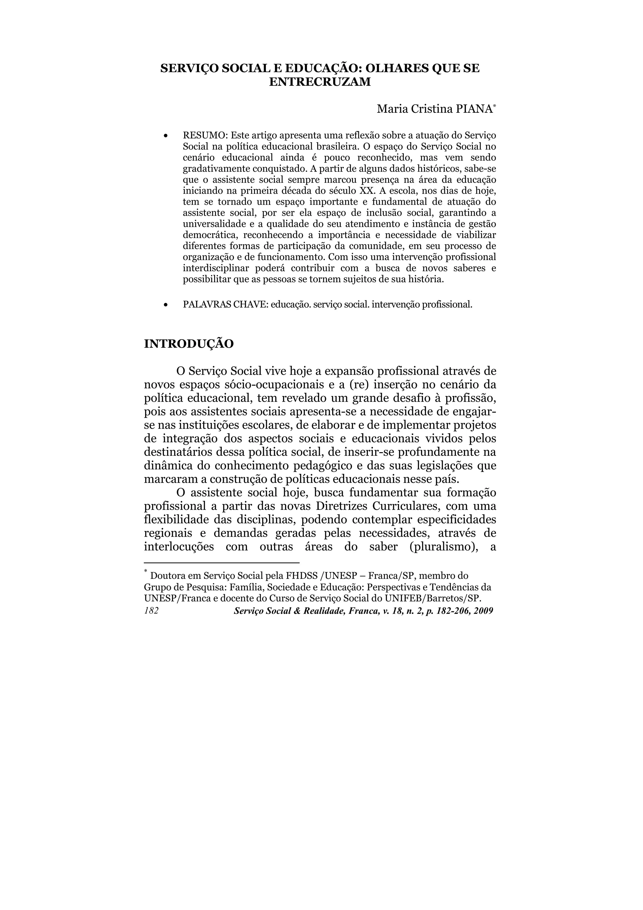 Este artigo discute a atuação do Serviço Social na política educacional brasileira. O Serviço Social esteve presente na educação desde o início do século XX, mas seu papel ainda é pouco reconhecido. Recentemente, o Serviço Social vem conquistando mais espaço na educação, trabalhando para promover a inclusão social e a participação da comunidade. Uma abordagem interdisciplinar pode ajudar a gerar novos conhecimentos e empoderar as pessoas.
