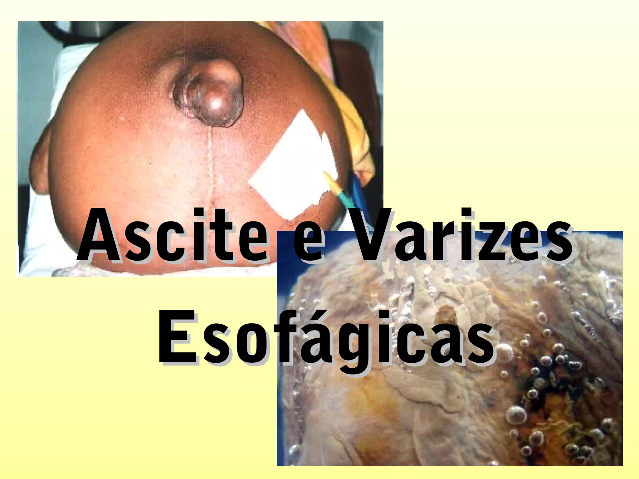 O documento discute ascite e varizes esofágicas como complicações da cirrose hepática. A ascite ocorre devido à hipertensão portal e hipoalbuminemia, resultando na acumulação de líquido na cavidade abdominal. As varizes esofágicas surgem devido ao aumento da pressão no sistema portal e são as complicações mais perigosas, podendo causar hemorragias graves.