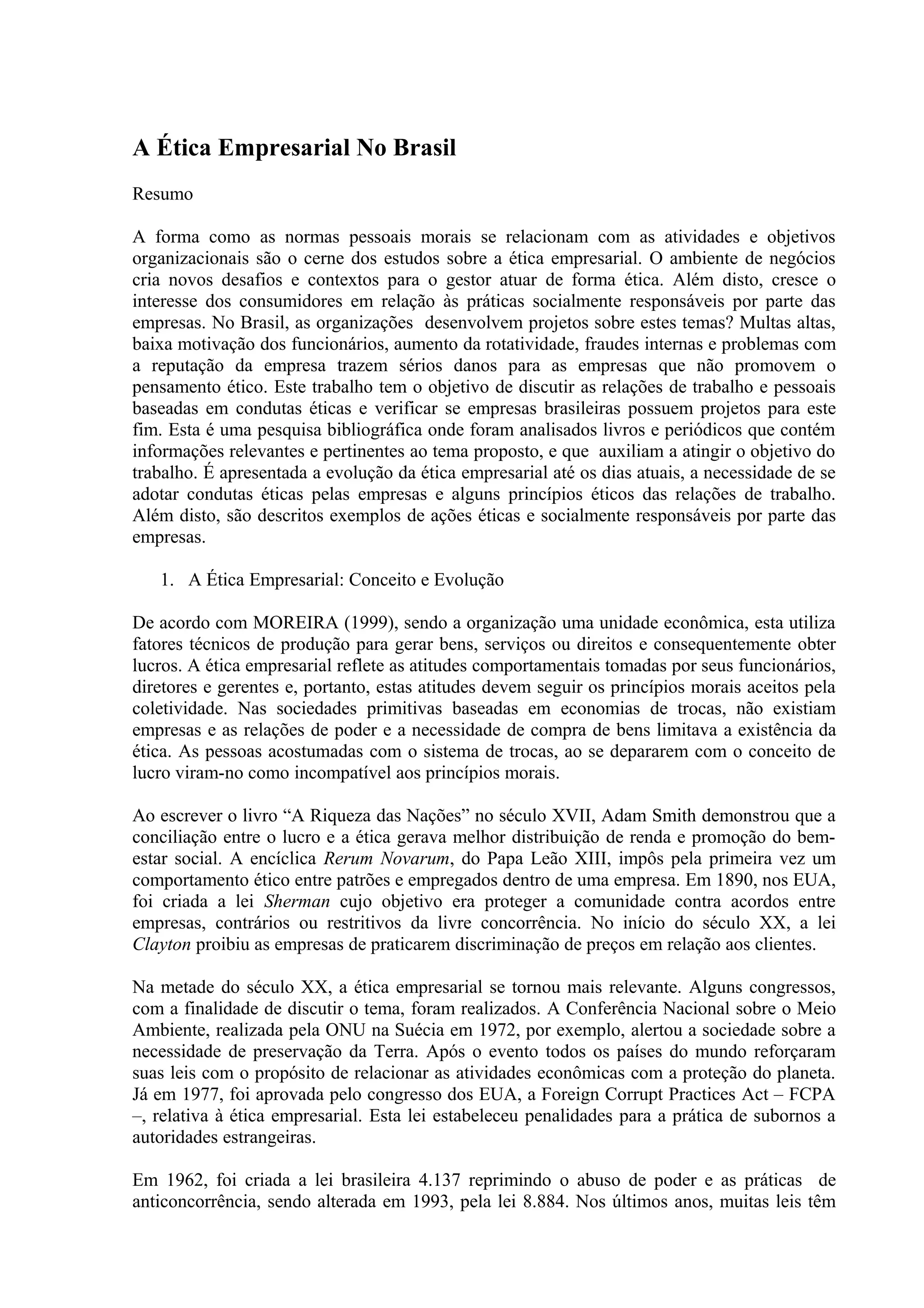O documento discute a ética empresarial no Brasil, abordando sua evolução e importância. Aponta que embora a "moral do oportunismo" ainda seja comum no país, as empresas precisam adotar práticas éticas para evitar problemas como multas, baixa motivação de funcionários e danos à reputação. Também destaca a necessidade de definir claramente os valores das organizações e integrá-los aos processos internos.