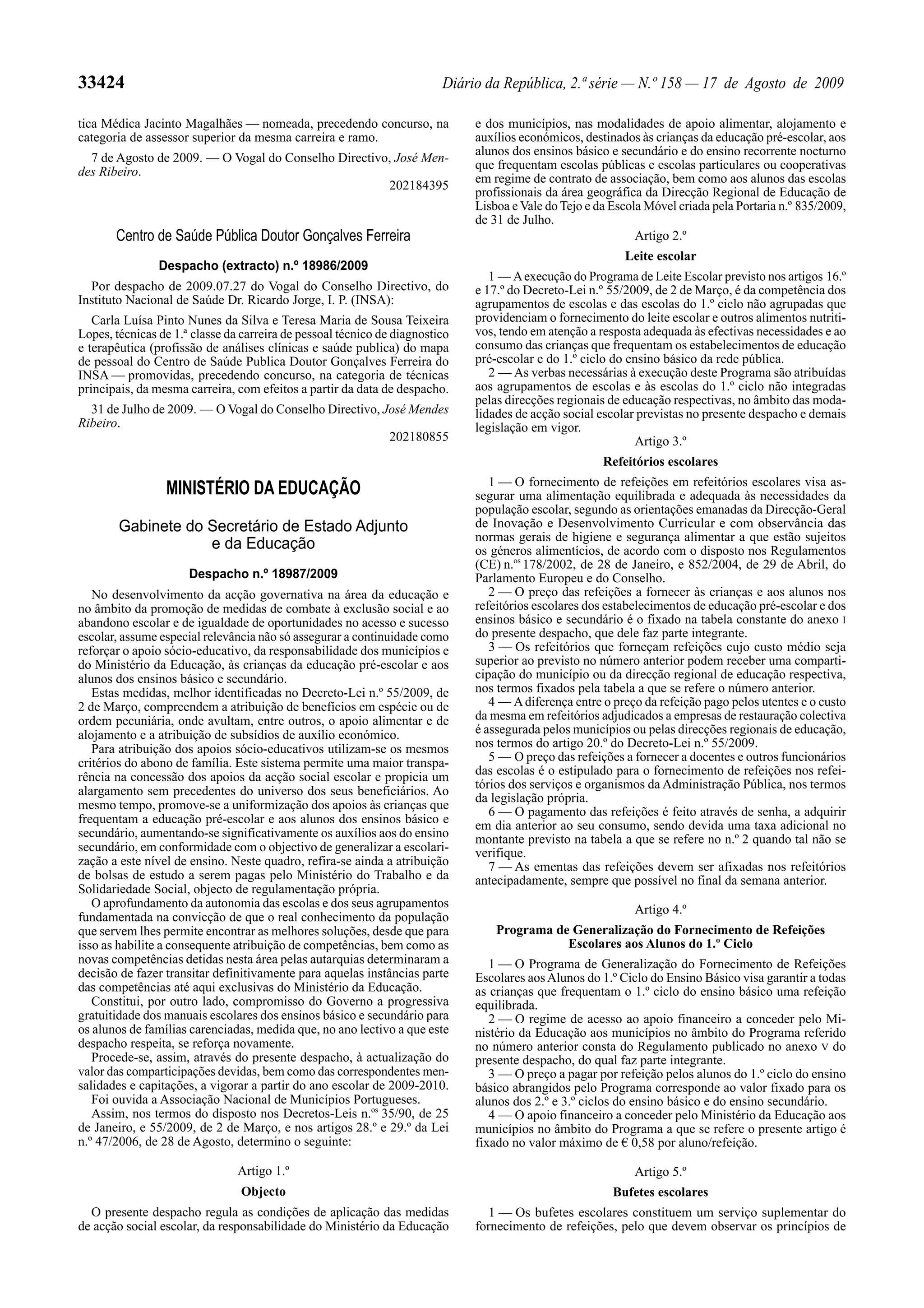 Este documento define as regras para o fornecimento de refeições e apoio alimentar às crianças e alunos da educação pré-escolar e dos ensinos básico e secundário em Portugal. Estabelece os preços máximos das refeições escolares e como será financiado o programa de generalização do fornecimento de refeições aos alunos do 1o ciclo do ensino básico pelos municípios e pelo Ministério da Educação.