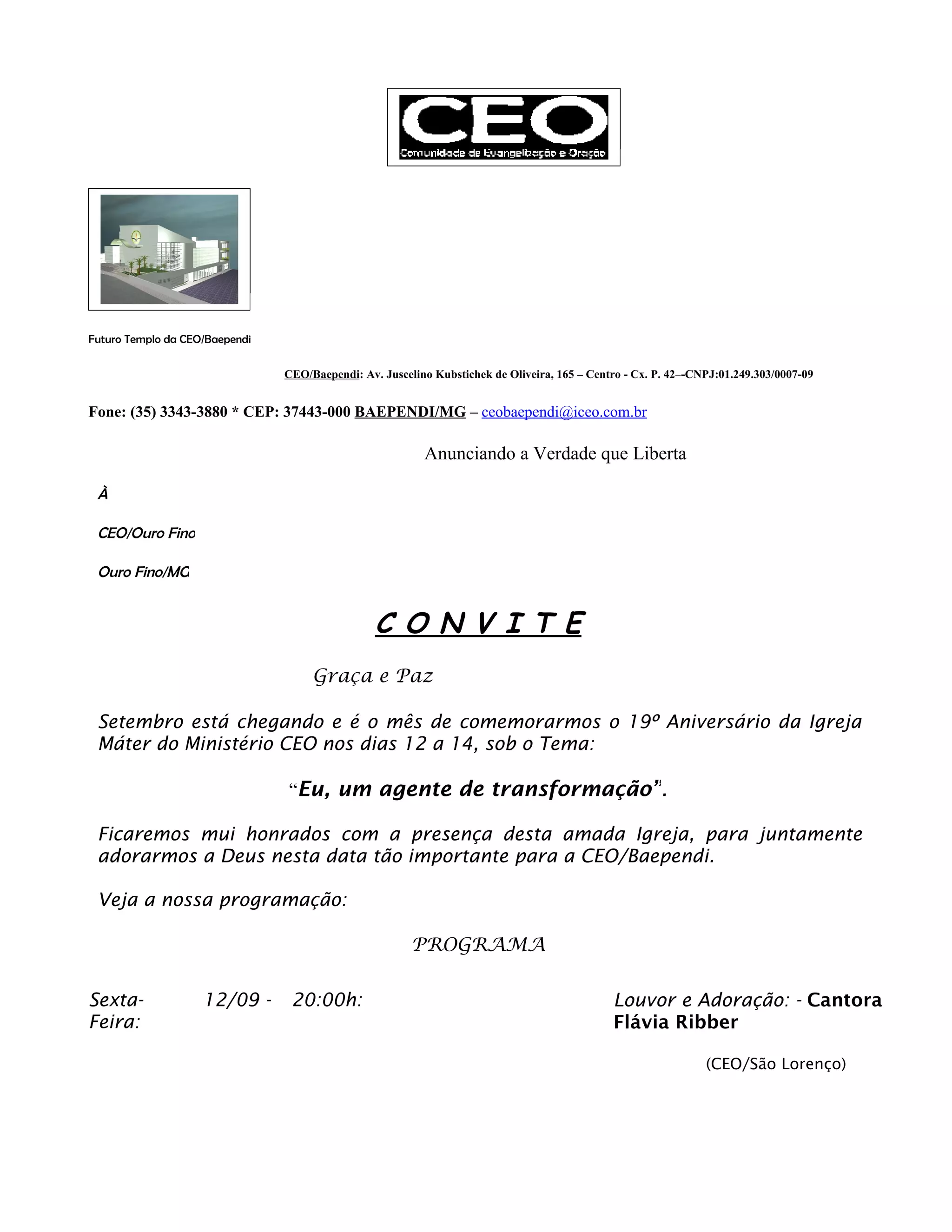 O documento convida a Igreja CEO/Ouro Fino para celebrar o 19o Aniversário da Igreja Máter do Ministério CEO nos dias 12 a 14 de setembro em Baependi. A programação inclui cultos com louvor, adoração, teatro e preletores nas noites de sexta e sábado e uma festa das águas e churrasco no domingo.