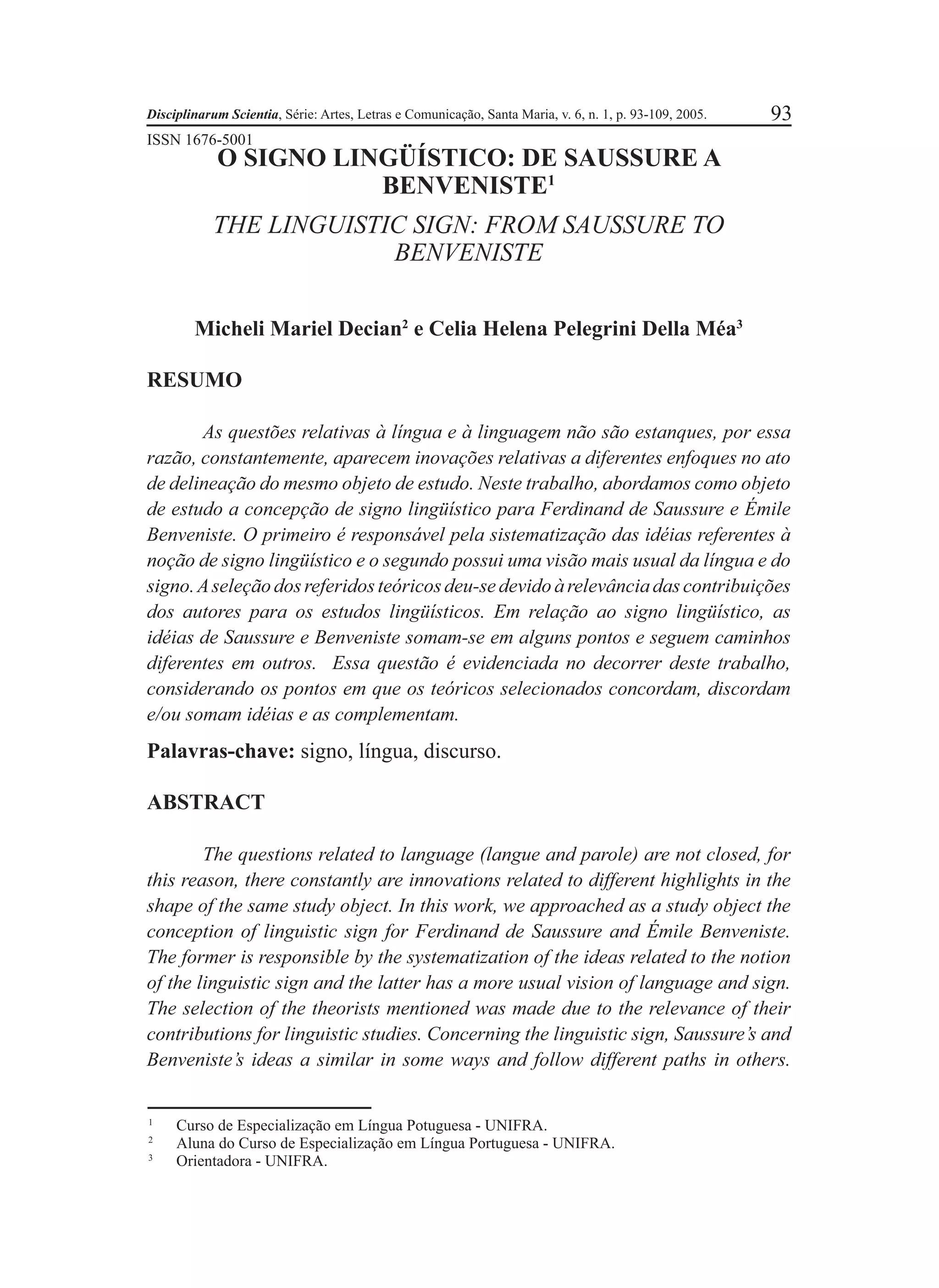 Este documento discute as concepções de signo linguístico de Ferdinand de Saussure e Émile Benveniste. Saussure definiu o signo linguístico como composto por um conceito (significado) e uma imagem acústica (significante), enquanto Benveniste viu a língua como se realizando na enunciação, levando em conta o locutor, o interlocutor e o contexto. Embora concordando em pontos, eles diferem principalmente no fato de Saussure ver a língua como um sistema abstrato e Ben
