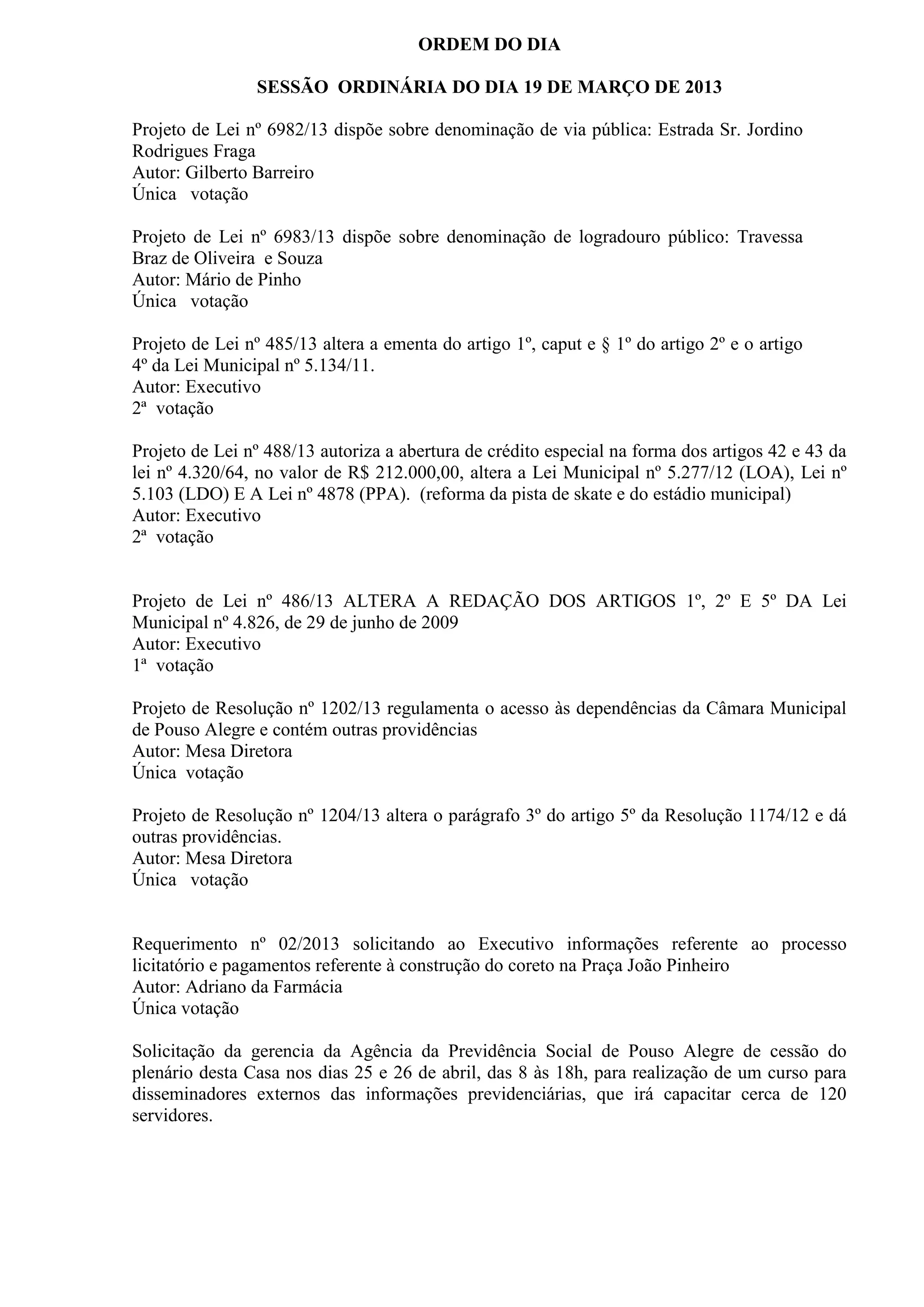 A ordem do dia propõe votações de projetos de lei para denominação de logradouros públicos, alterações em leis municipais, autorização de crédito especial e alterações em leis anteriores. Também inclui votações de projetos de resolução sobre acesso à Câmara Municipal e alterações em resolução anterior, além de requerimento de informações e solicitação de cessão do plenário para capacitação de servidores.