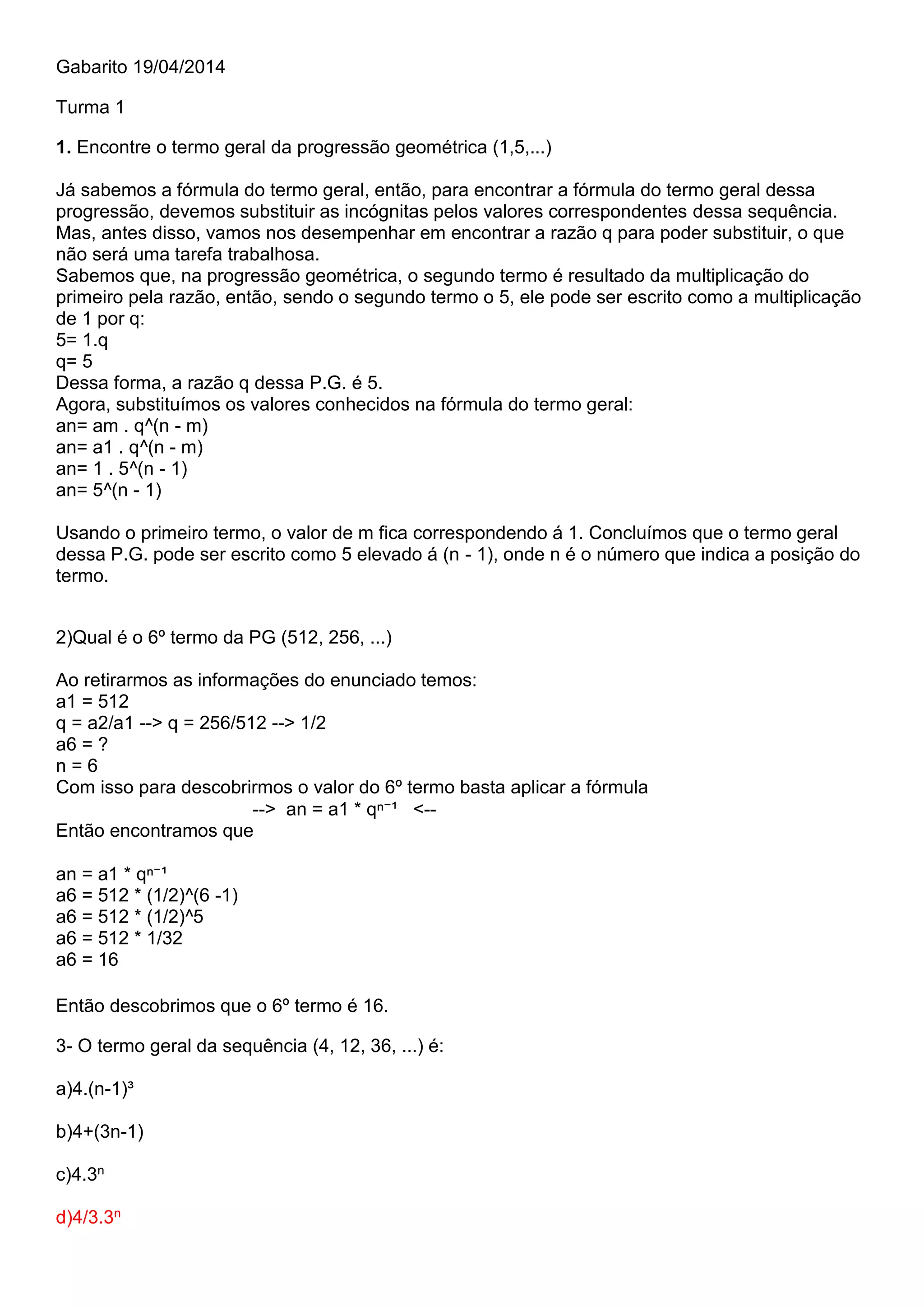 Este documento fornece a resolução de exercícios de uma prova de matemática. O primeiro exercício trata da progressão geométrica e encontra o termo geral da sequência (1,5,...). O segundo exercício pede para encontrar o 6o termo da progressão geométrica (512, 256,...). O terceiro exercício pede para identificar o termo geral da sequência (4, 12, 36,...).