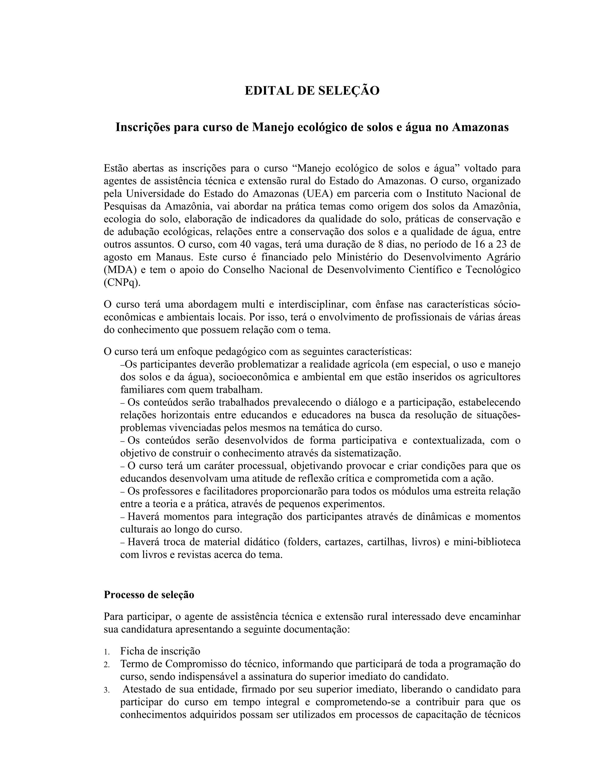 Este documento anuncia a abertura de inscrições para um curso sobre manejo ecológico de solos e água na Amazônia com 40 vagas entre 16 e 23 de agosto. O curso abordará temas como origem dos solos, ecologia do solo, conservação dos solos e qualidade da água. Os interessados devem enviar documentação como ficha de inscrição, termo de compromisso e currículo até 26 de julho.