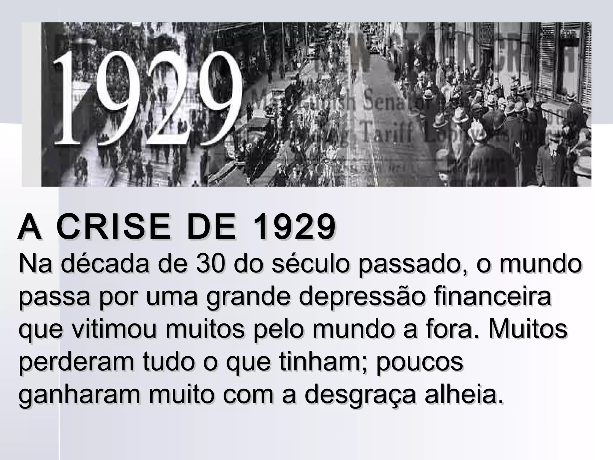 A crise econômica de 1929 teve início nos Estados Unidos e se espalhou pelo mundo, causando grande depressão. A quebra da Bolsa de Valores de Nova York levou à falência de bancos e empresas, gerando alto desemprego. No Brasil, a crise reduziu a exportação de café e levou ao fim da República Velha.