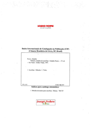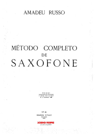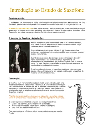 1) O documento fornece instruções sobre como tocar saxofone, incluindo detalhes sobre a história do instrumento, seu inventor Adolphe Sax, partes do saxofone, técnica e articulação.