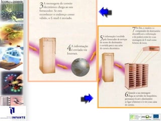 O documento discute o email, incluindo sua funcionalidade de enviar mensagens rapidamente pela internet, armazenamento no servidor do destinatário até que ele acesse, e conveniência em relação a cartas e fax. Também menciona endereços de email, programas de email, privacidade, anexos, webmail, erros de endereço, etiqueta de email e cabeçalhos.