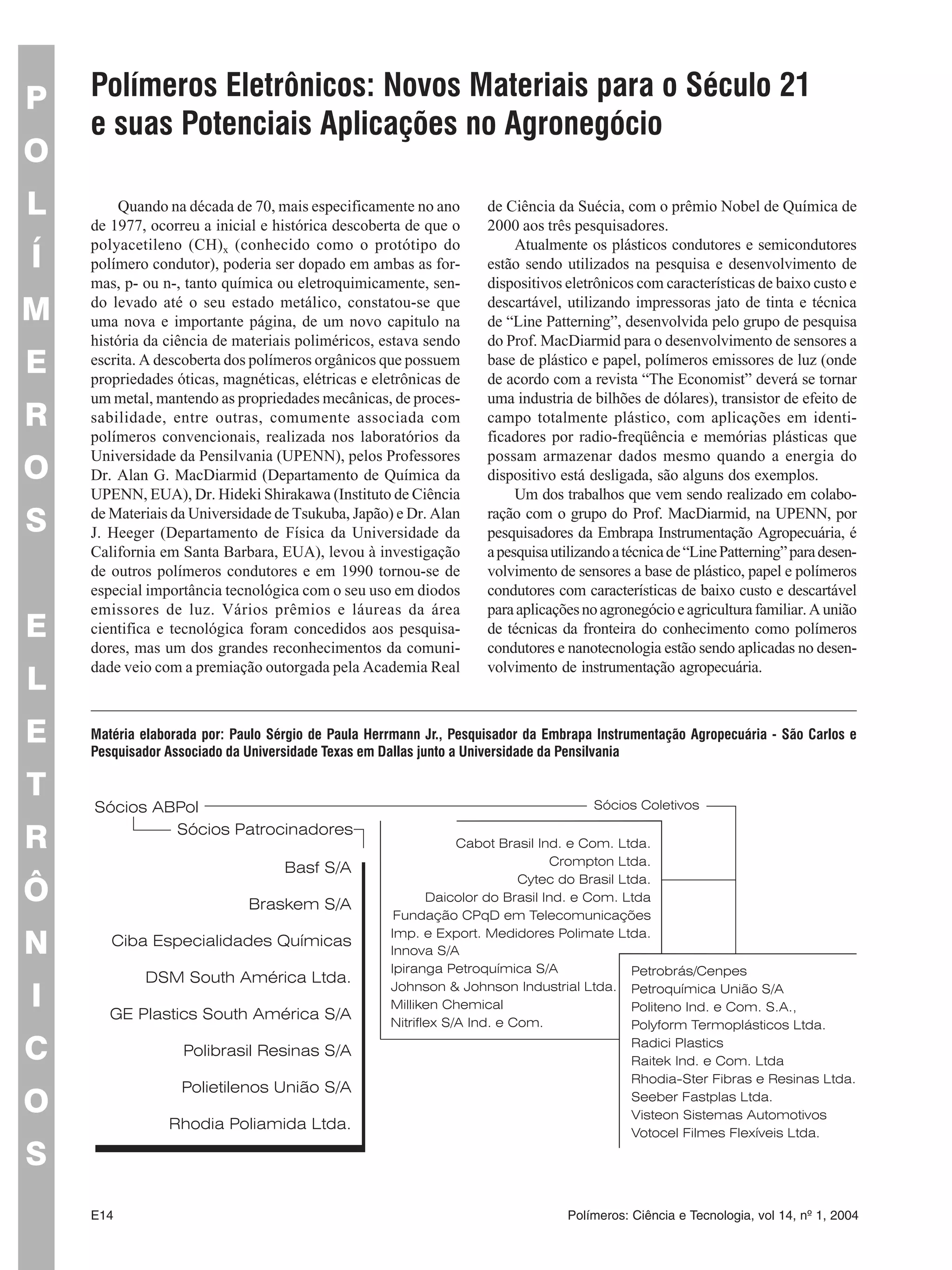 Polímeros eletrônicos são novos materiais com propriedades condutoras e semicondutoras. Eles podem ser usados para fabricar dispositivos eletrônicos baratos e descartáveis. Pesquisadores no Brasil e nos EUA estão desenvolvendo sensores à base de polímeros para aplicações agrícolas usando técnicas de impressão a jato de tinta.