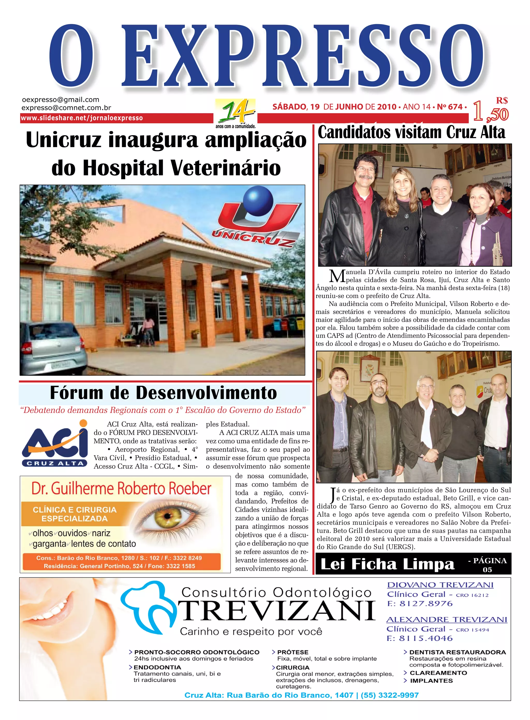 A Unidade de Terapia Renal do Hospital São Vicente de Paulo realiza atendimento ambulatorial de referência para pacientes com doenças renais e diabéticos da região. O jornal também noticia a visita da secretária de saúde à cidade de Ibirubá para marcar um encontro sobre a ampliação dos atendimentos nefrológicos. Candidatos políticos visitam a cidade de Cruz Alta e se reúnem com autoridades locais.