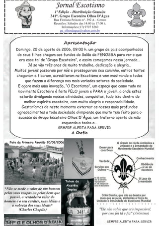 Este documento apresenta as atividades e história do 341° Grupo Escoteiro Olhos D'Água. Ele celebra 3 anos de fundação com diversas atividades e foi reconhecido como Entidade de Utilidade Pública Municipal. Também resume a história do Escotismo e seu fundador Baden-Powell.