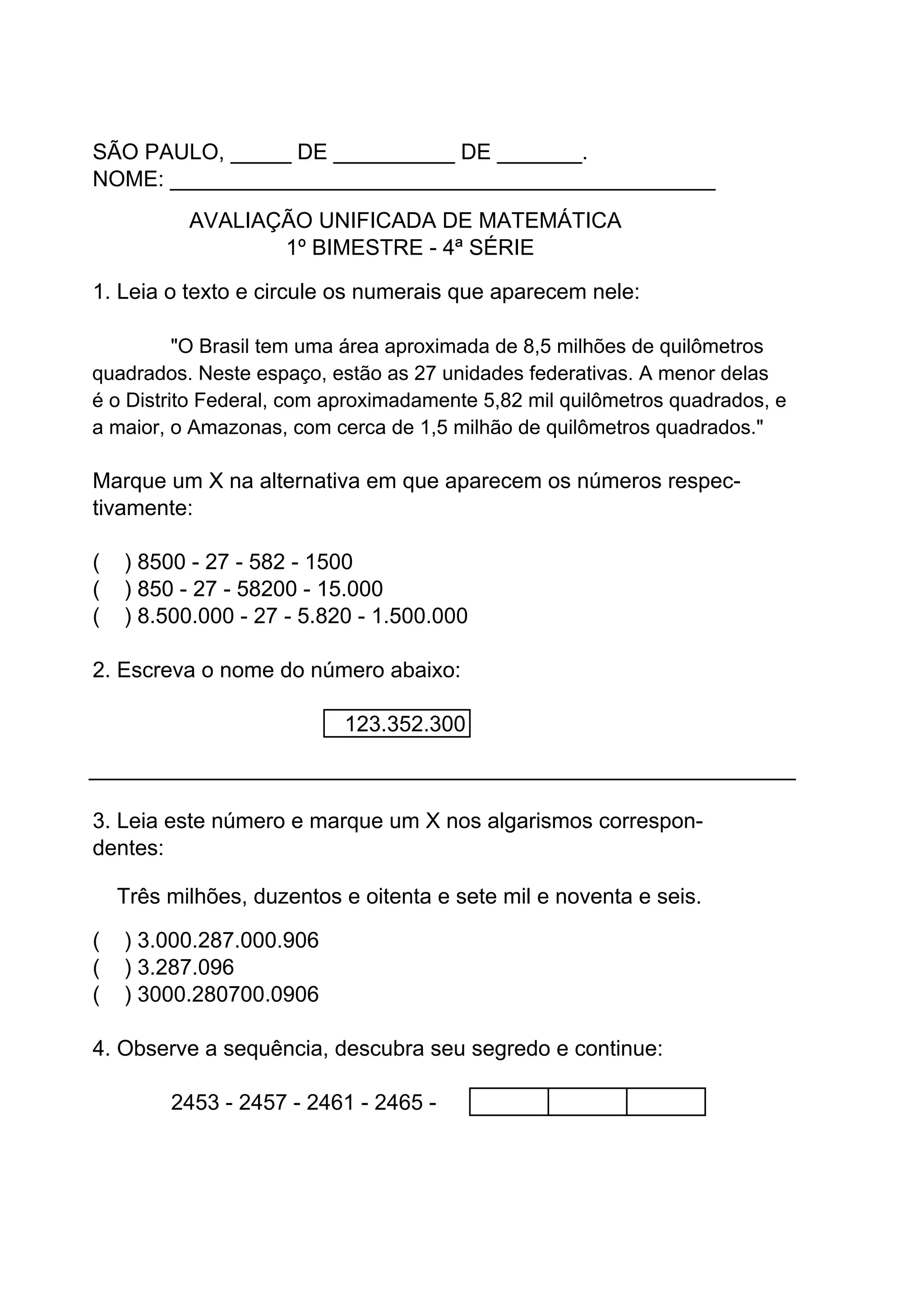 1) O documento apresenta uma avaliação de matemática para alunos do 4o ano com questões sobre números, operações matemáticas e interpretação de dados.
