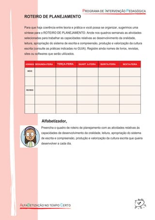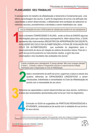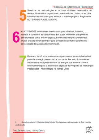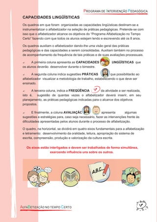 O documento fornece diretrizes para as práticas pedagógicas do segundo bimestre do primeiro ano do ciclo da alfabetização. Ele apresenta sugestões para desenvolver a linguagem oral, leitura e escrita dos alunos com foco no tema "festas juninas", incluindo atividades como rodas de conversa, pesquisas, apresentações orais e trabalhos manuais. O documento enfatiza a importância da avaliação contínua do desenvolvimento individual de cada aluno.