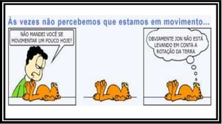O documento discute conceitos básicos de cinemática e dinâmica, incluindo: (1) movimento e repouso são conceitos relativos que dependem do referencial; (2) definição de referencial; (3) leis de Newton sobre inércia, F=ma e ação-reação.