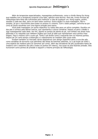 O documento discute a técnica da reflexologia, que envolve a massagem de pontos específicos nos pés para aliviar tensões e melhorar o fluxo de energia no corpo. Explica que cada ponto nos pés corresponde a uma parte do corpo e que a massagem desses pontos pode aliviar dores e problemas de saúde. Também fornece dicas sobre como realizar a auto-massagem nos pés.